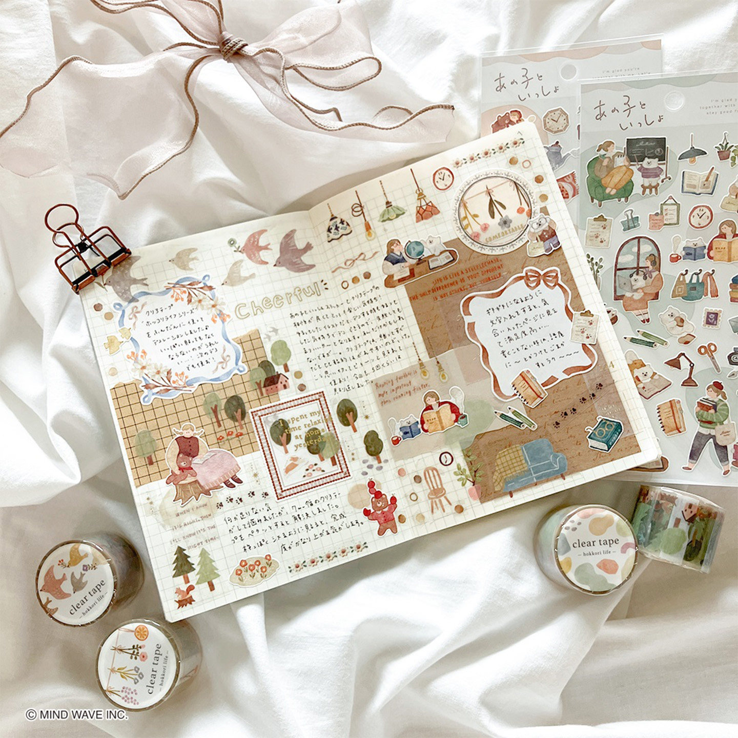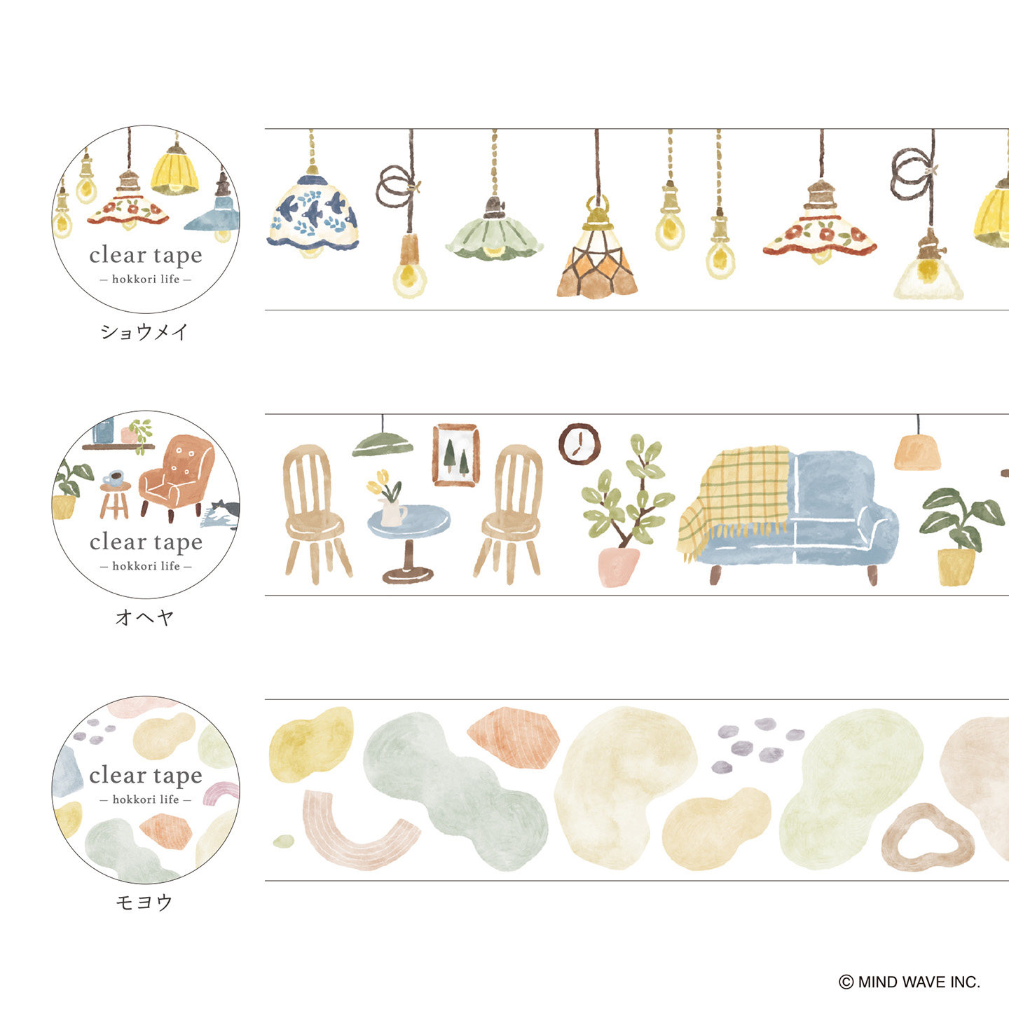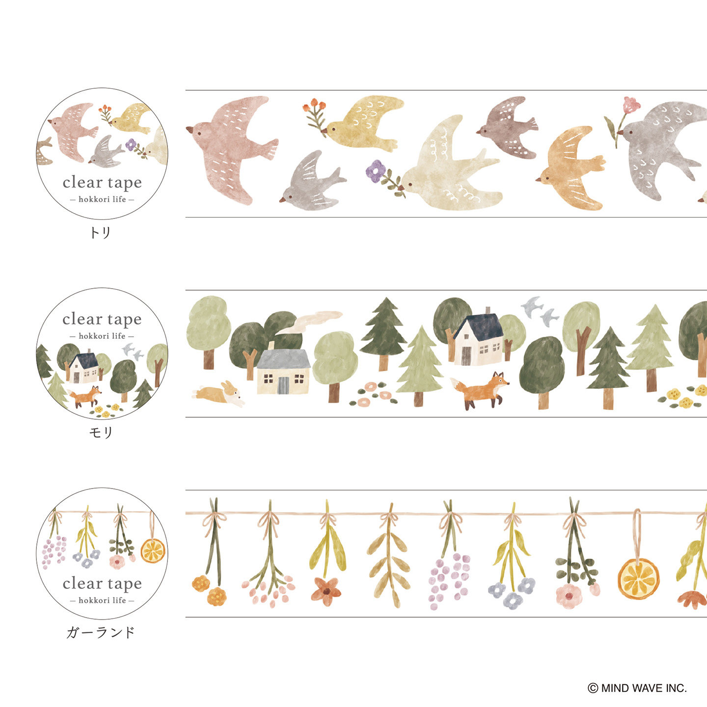 日本mind wave雾面透明PET胶带温馨生活系列鸟树花环吊灯家居图案淡色手绘风格手帐日记相册拼贴素材贴画