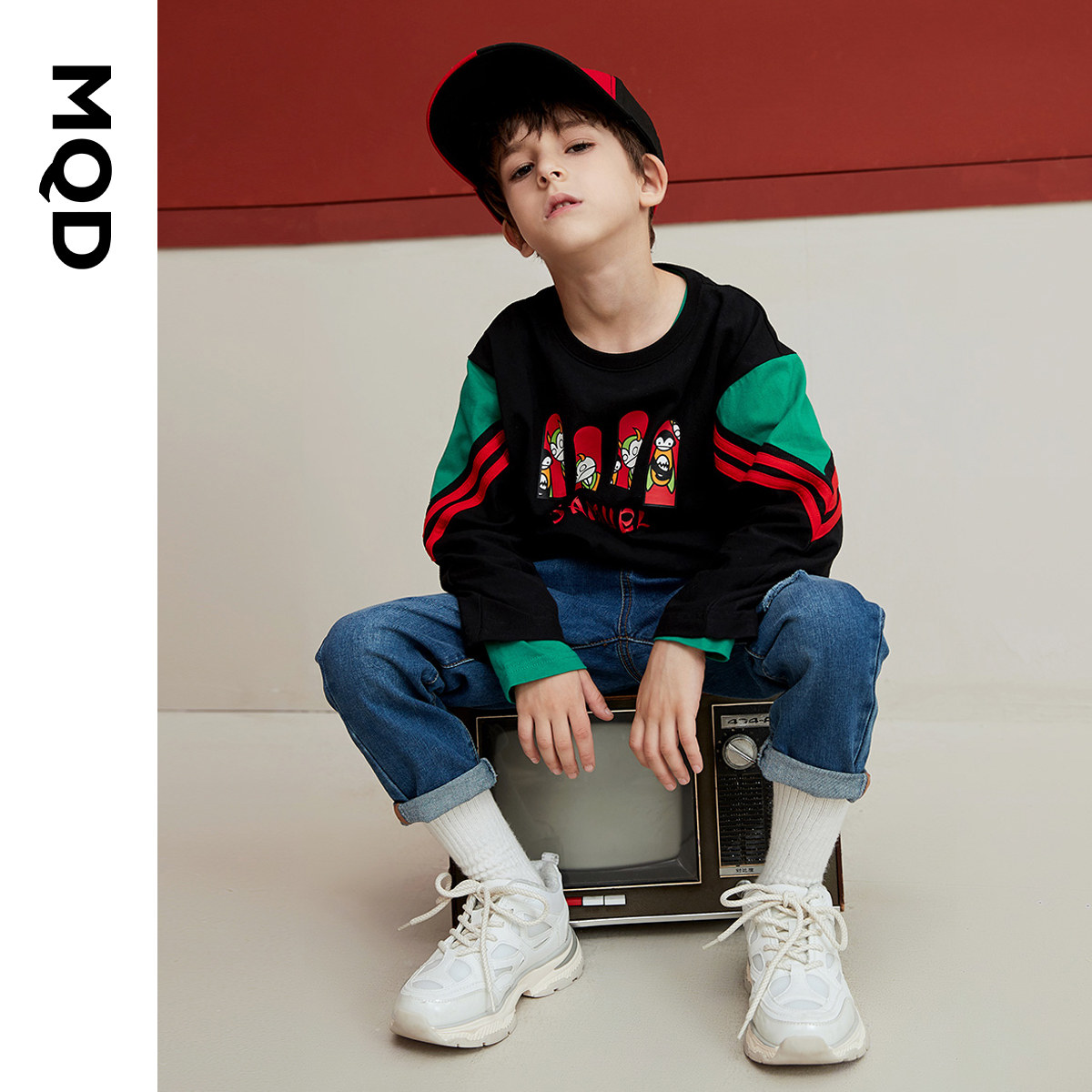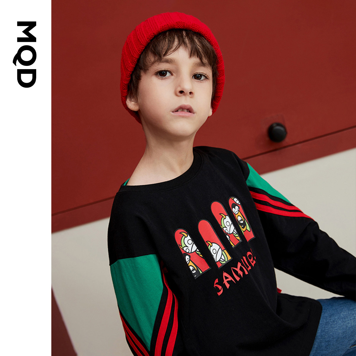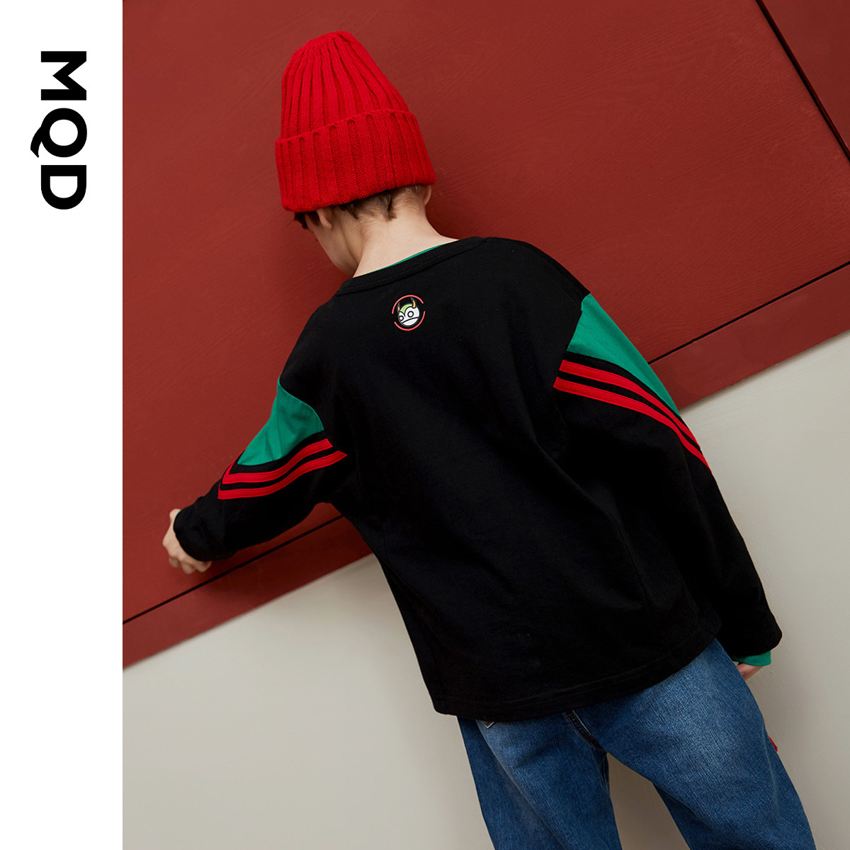 MQD男童长袖T恤纯棉儿童拼接春装中大童宽松印花时尚运动上衣