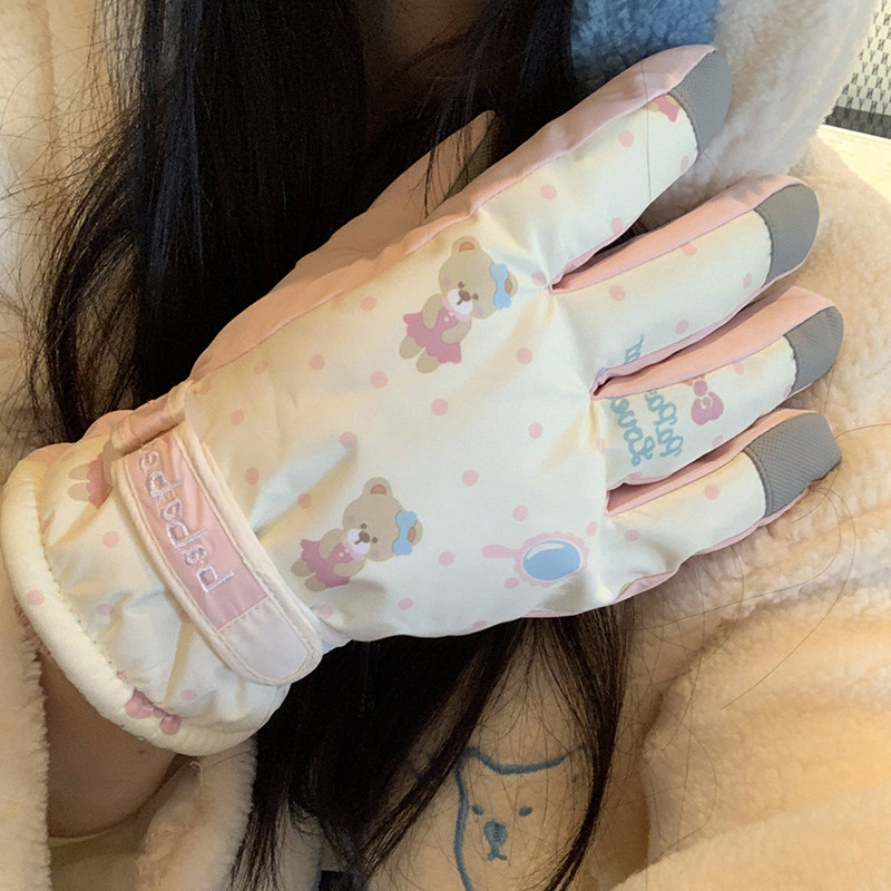 米色可爱小熊滑雪手套女冬季韩系保暖加绒加厚户外防风防寒骑车潮