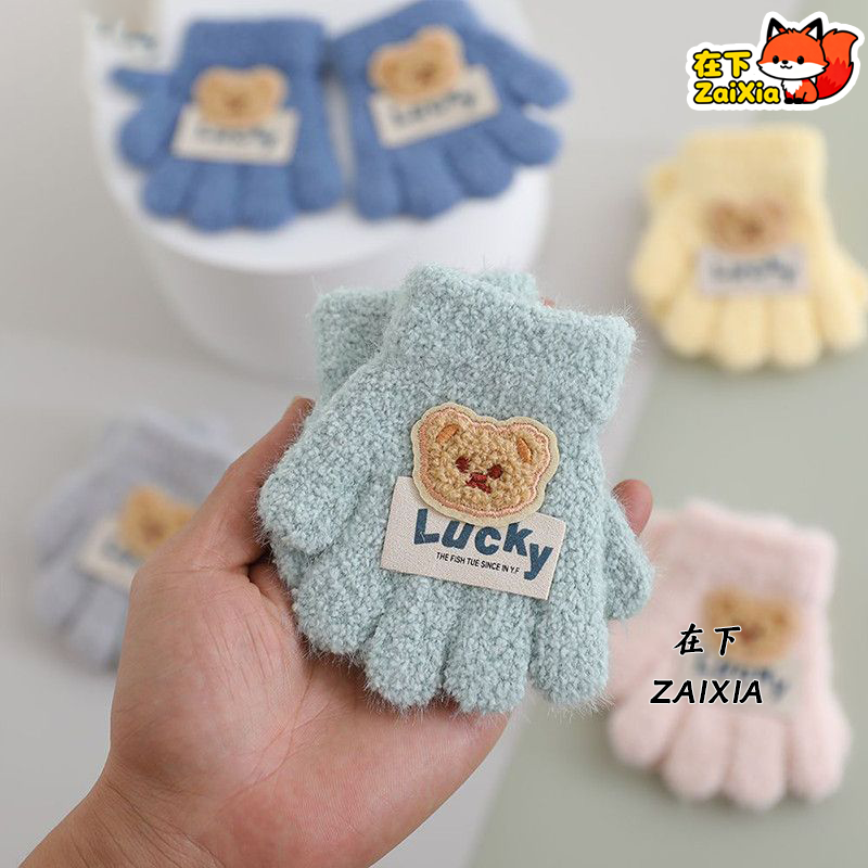 宝宝五指儿童手套秋冬季小熊珊瑚绒男童分指保暖防寒女童护手小孩