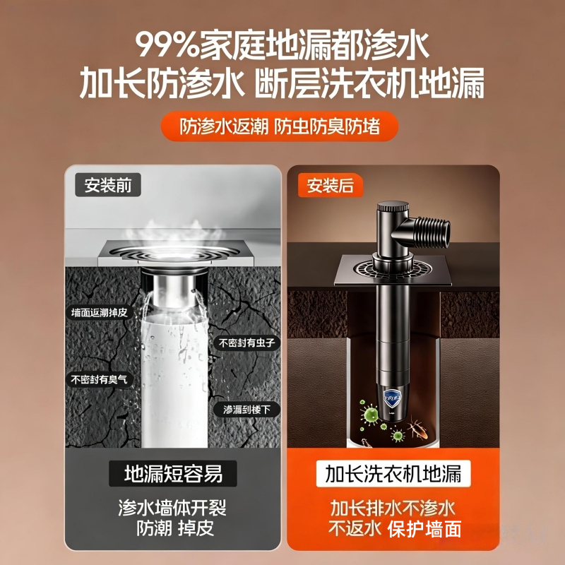 洗衣机地漏专用接头下水排水管道防反溢水二合一三通方形地漏盖子