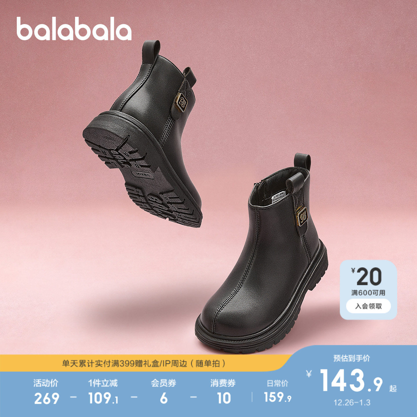 巴拉巴拉童鞋儿童靴子马丁靴女童2025新秋冬短靴拉链潮流百搭鞋子
