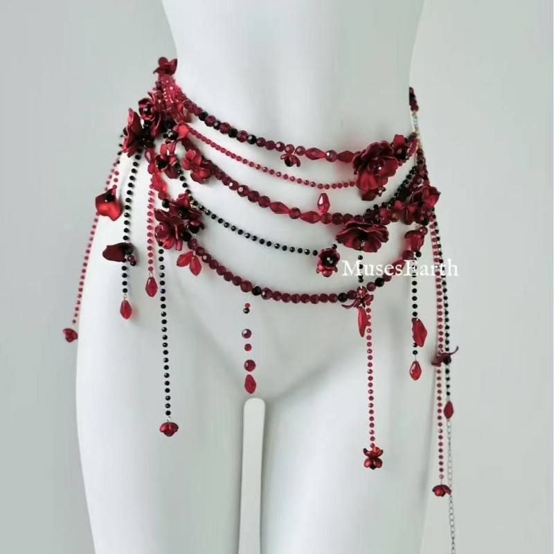 暗夜缨红腰链 红色繁花身体链可当项链女配饰哥特风配裙子腰封