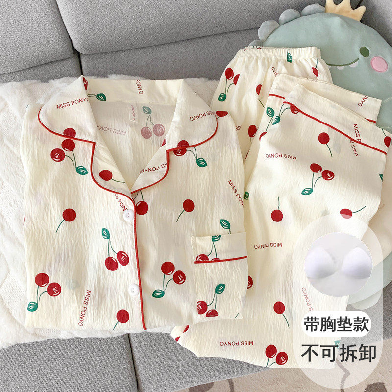 红豆带胸垫云朵纯棉纱睡衣女长袖春秋款套装甜美碎花高级感家居服