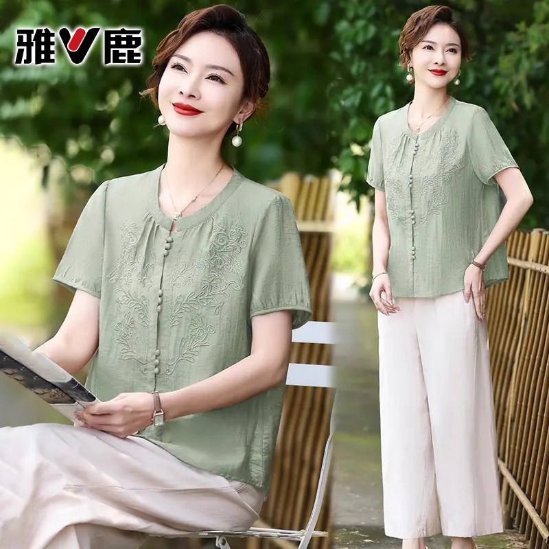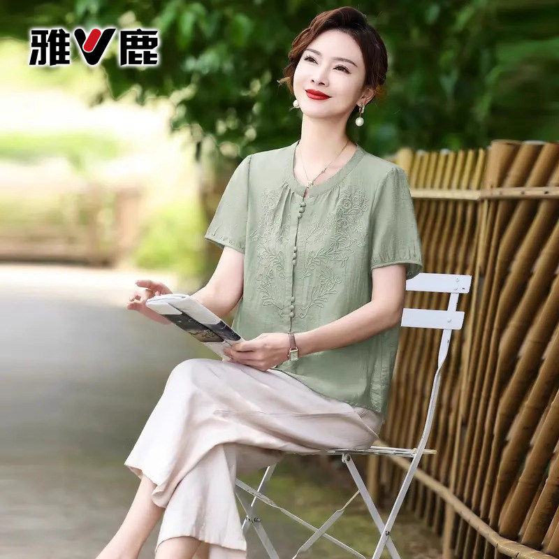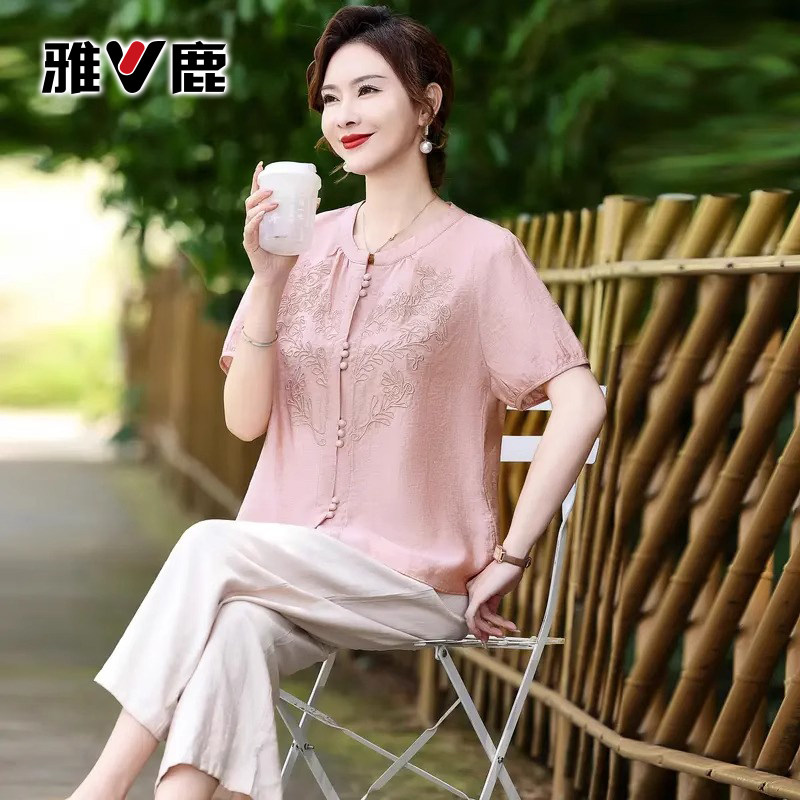 雅鹿正品妈妈夏季洋气国风短袖女夏装时尚中老年新中式上衣服衬衫