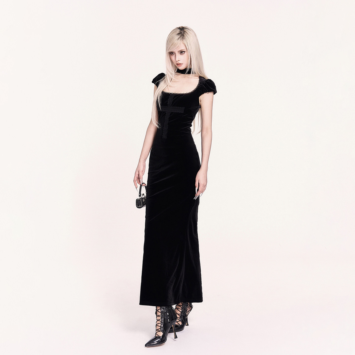 VOCK 暗里着迷 暗黑色气质丝绒长裙子拼接蕾丝收腰显瘦包臀鱼尾裙