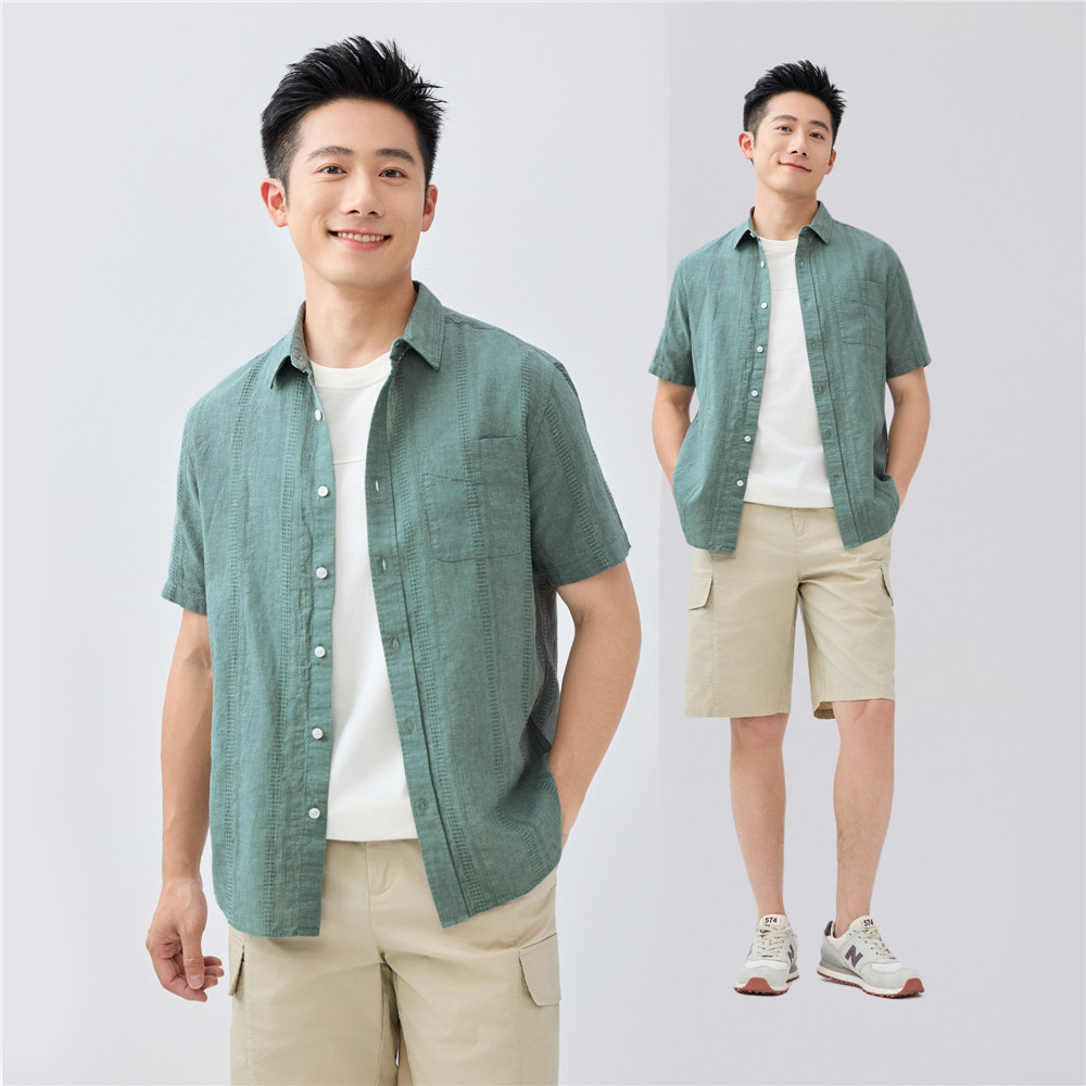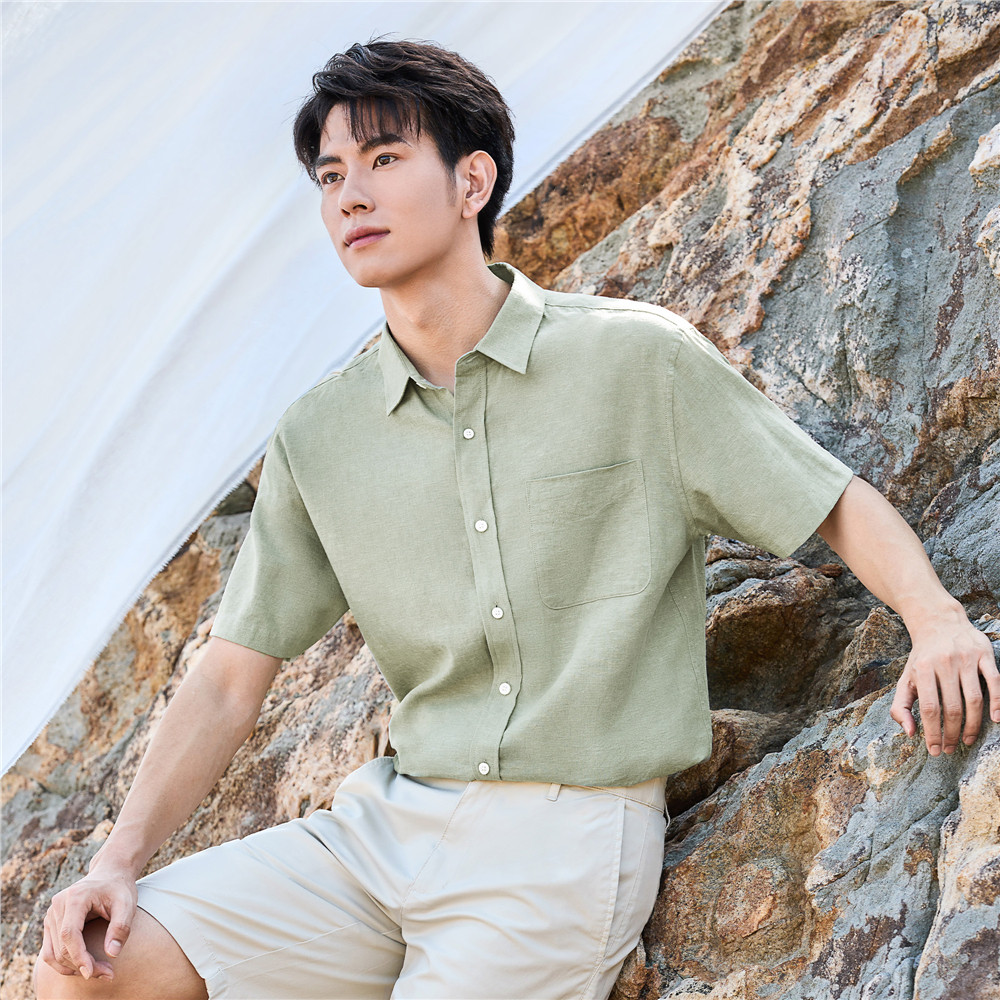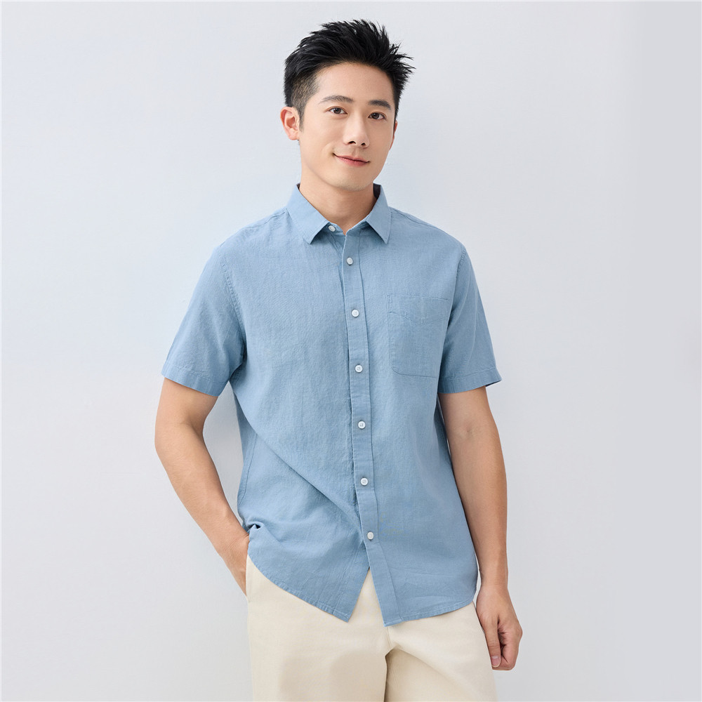 佐丹奴亚麻衬衫男夏季新款棉麻单口袋通勤休闲衬衣男短袖01045480