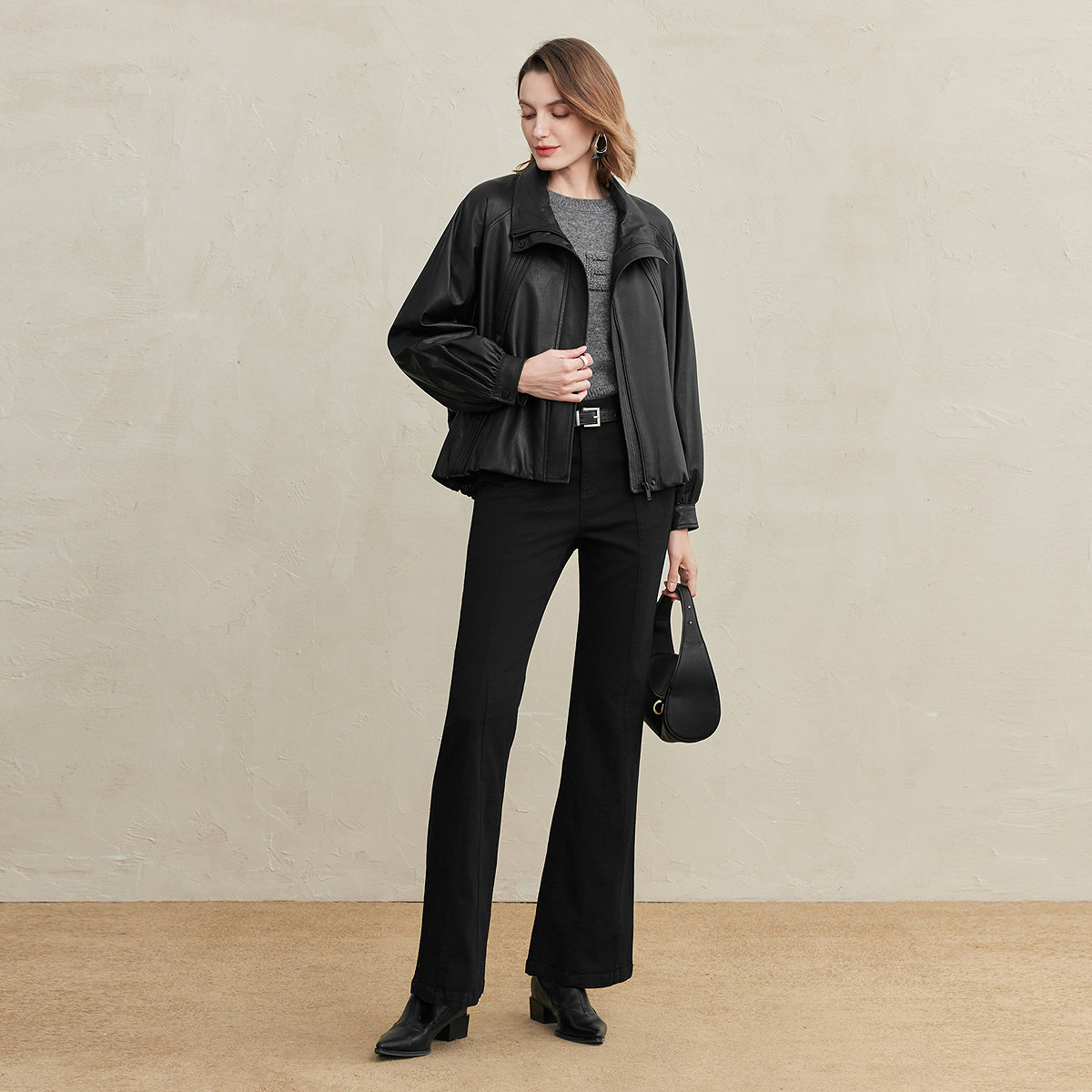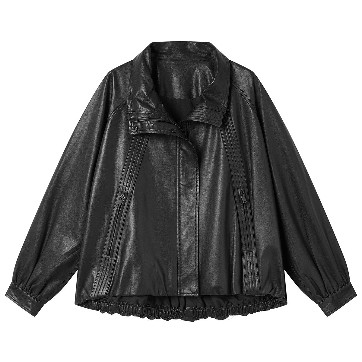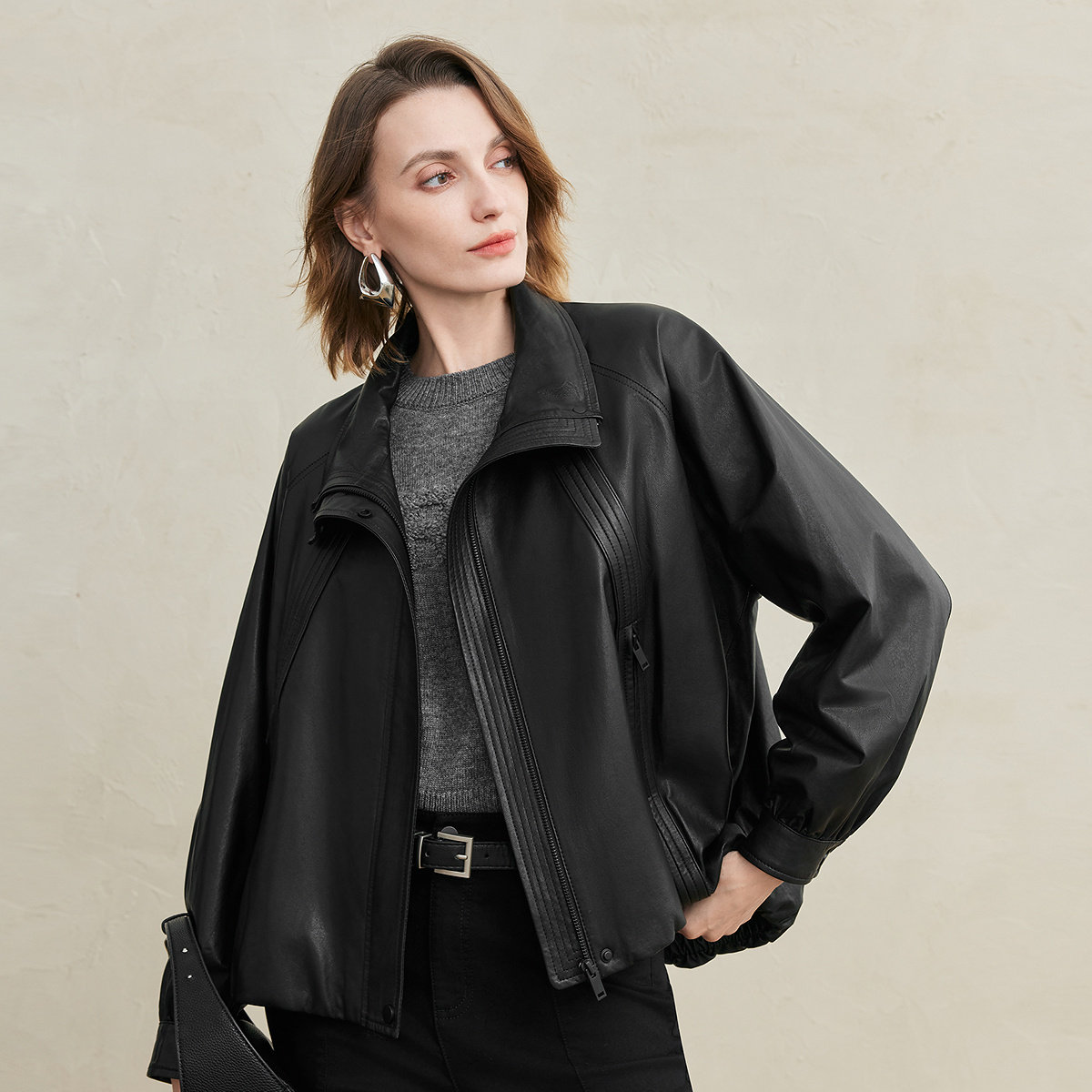 Eland衣恋皮衣女纯色带拉链长袖翻领外套2025冬季新款