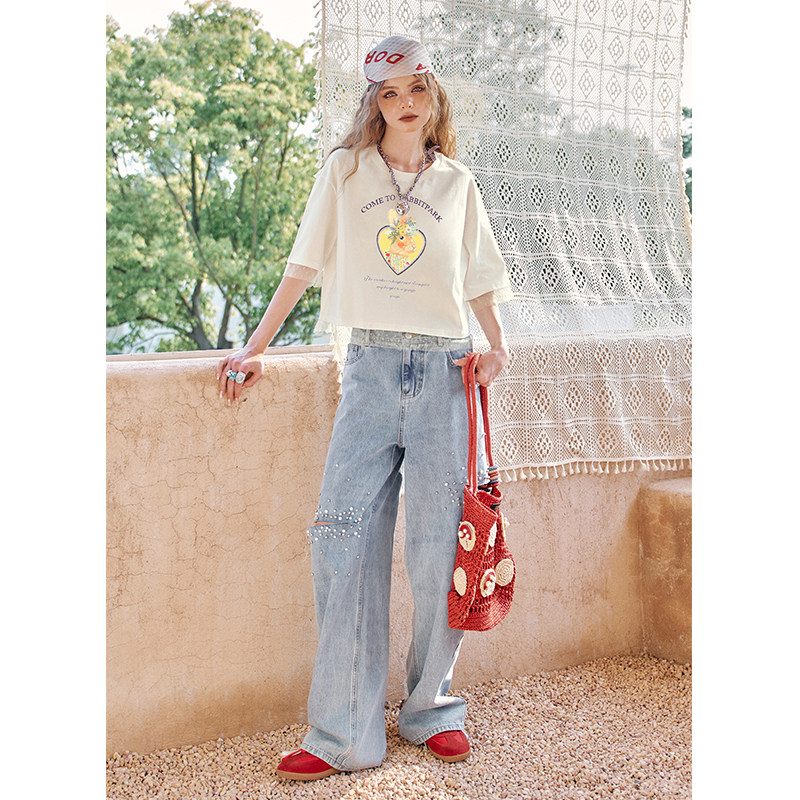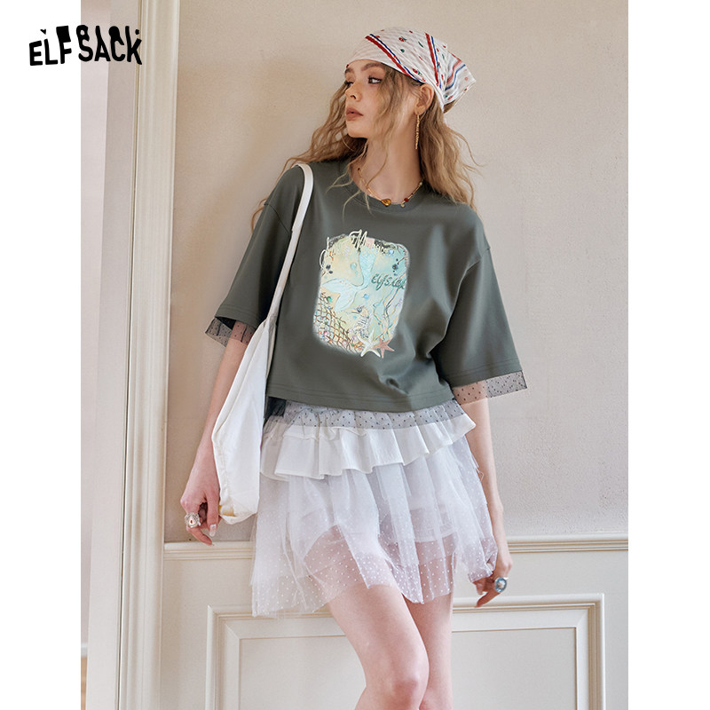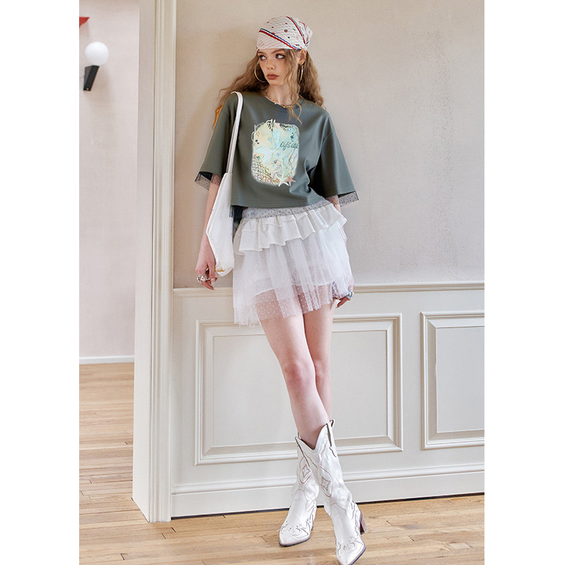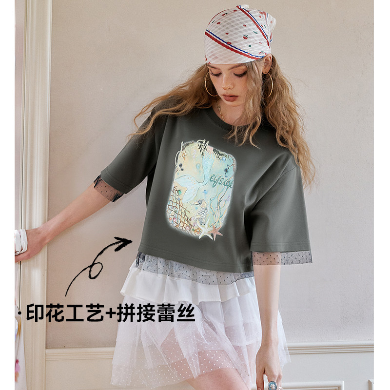 妖精的口袋白色蕾丝拼接印花短袖t恤女2025夏季新款休闲短款上衣