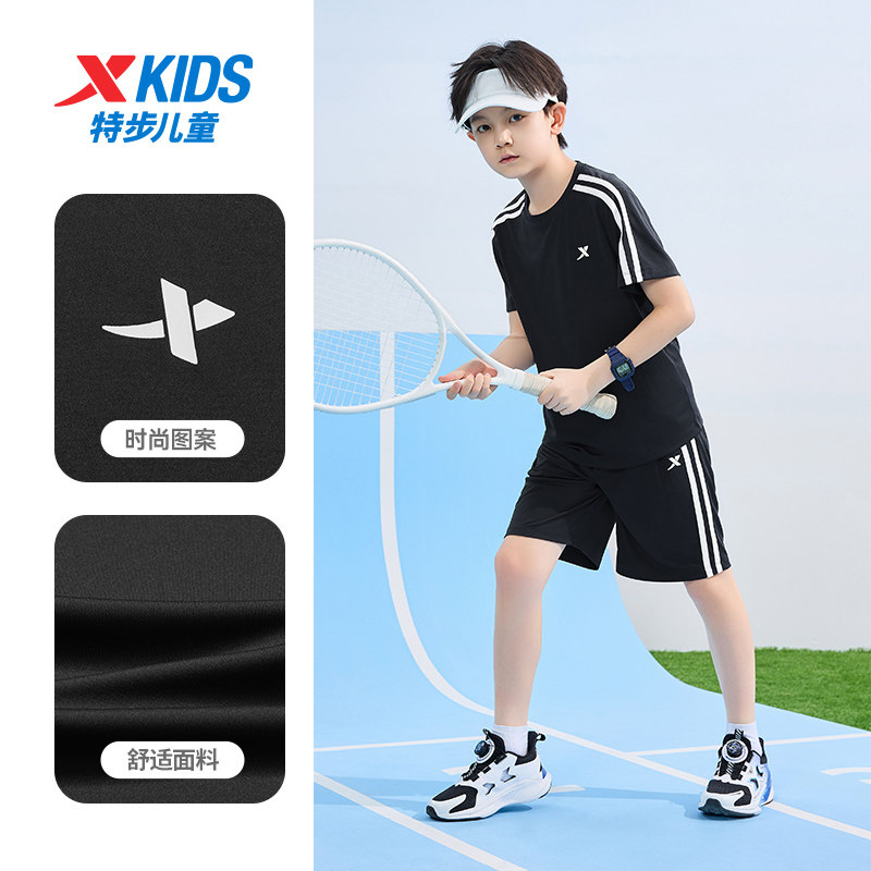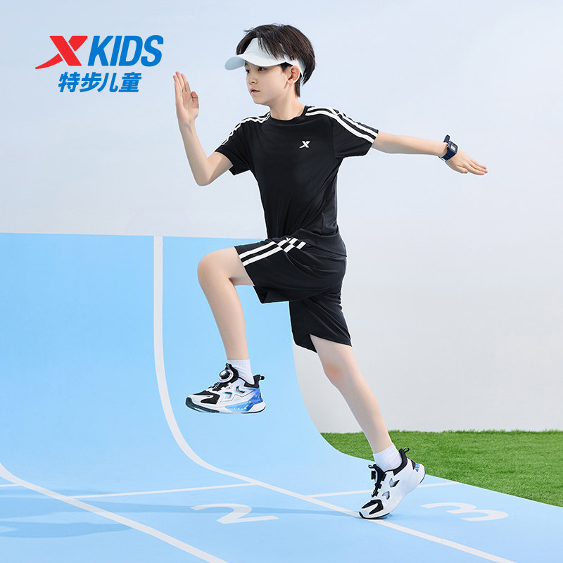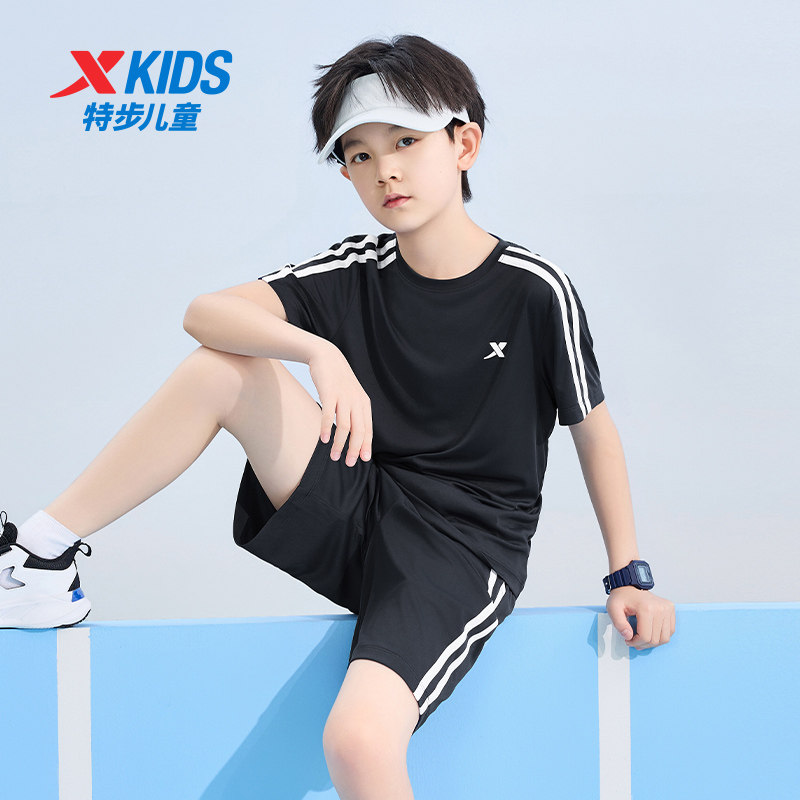 特步童装儿童夏季套装男童新款2025速干透气运动套短袖T短裤2件装