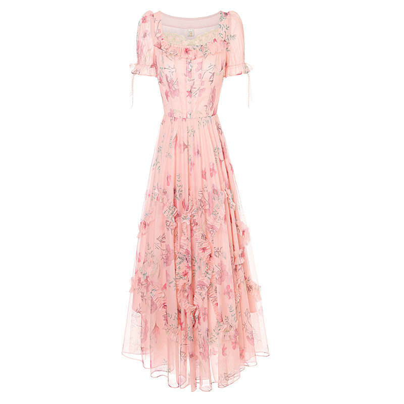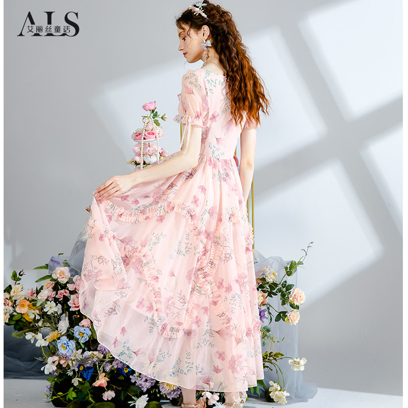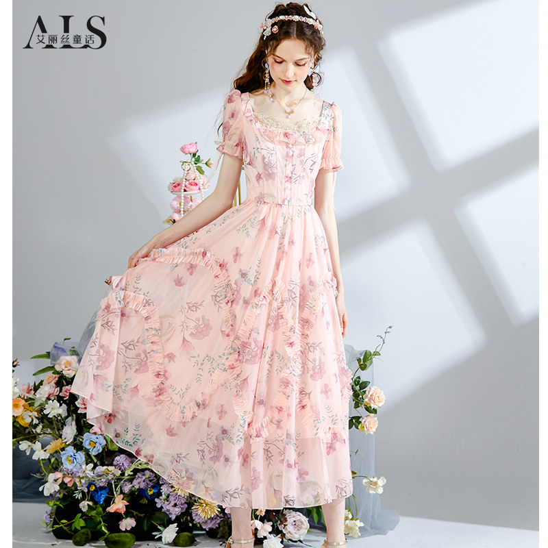 艾丽丝2025夏季新款甜美粉色印花连衣裙仙气重工刺绣中长款A字裙