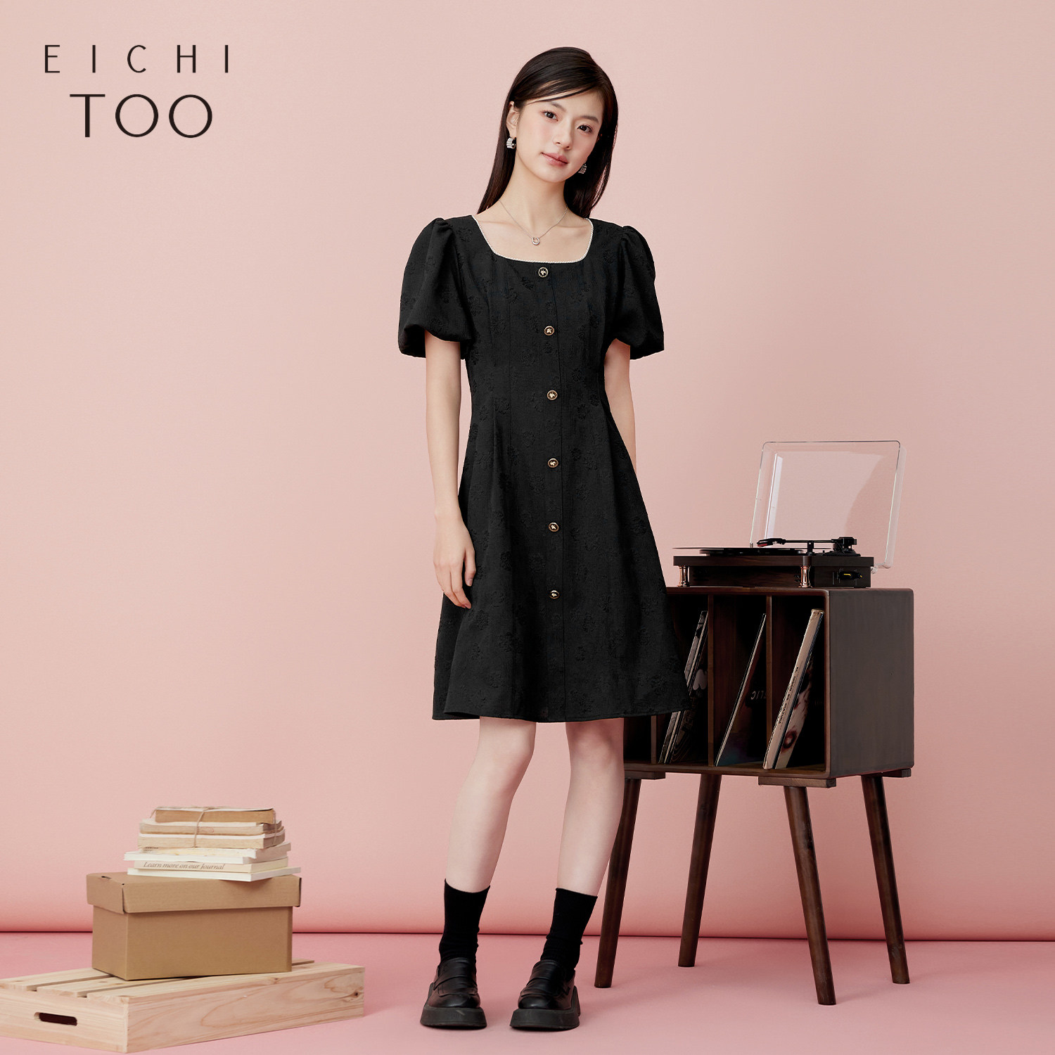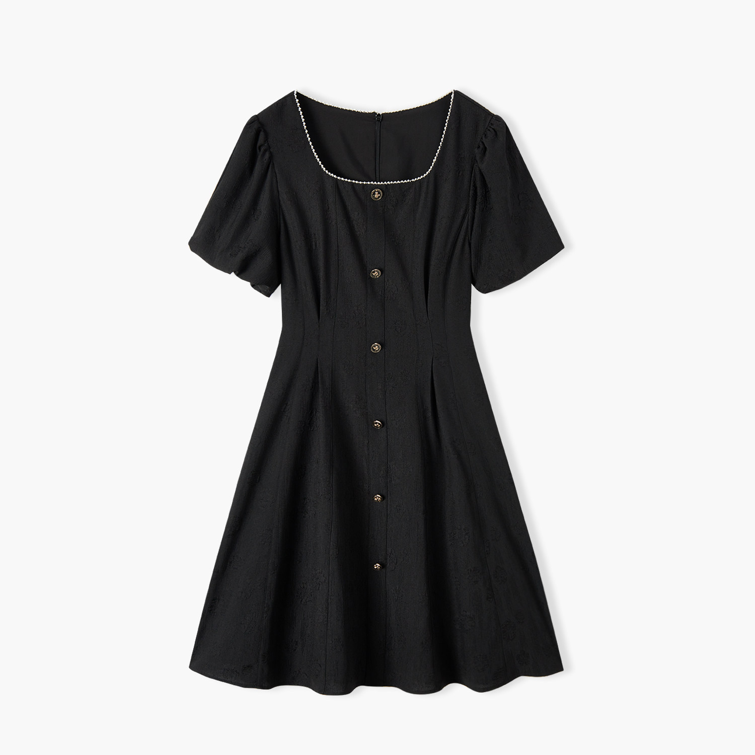 爱居兔夏季新款法式方领赫本风显瘦小黑裙短袖连衣裙