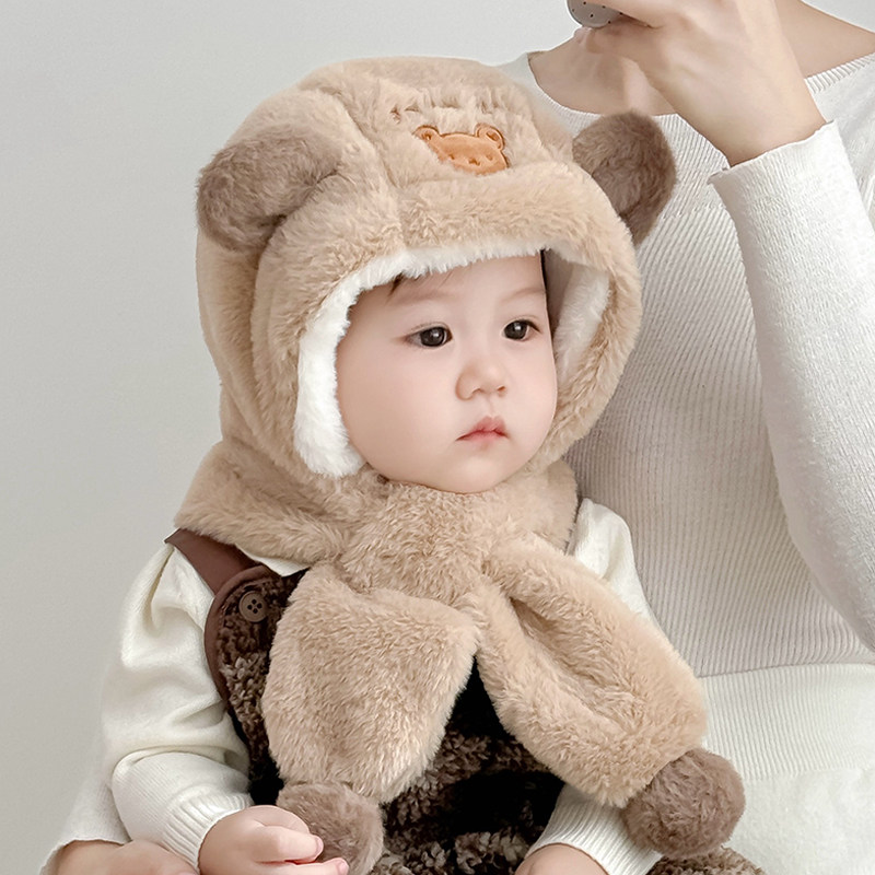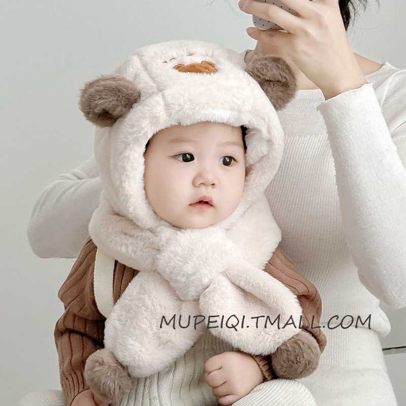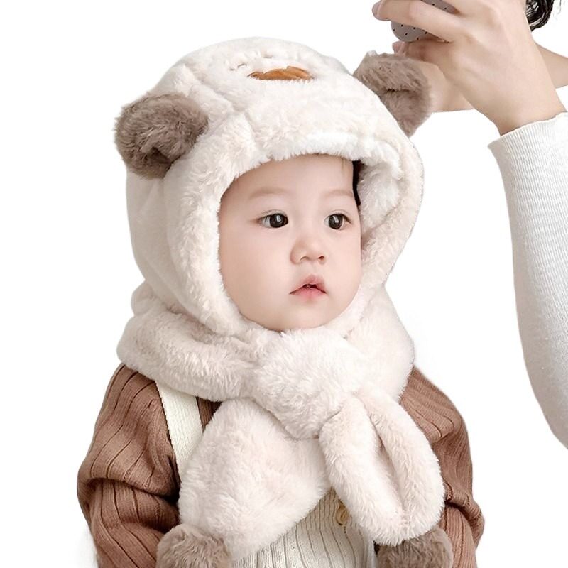 尼多熊婴儿帽子围巾一体宝宝毛绒帽婴幼儿冬季保暖儿童防风护耳帽