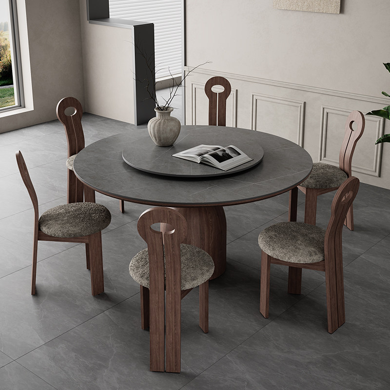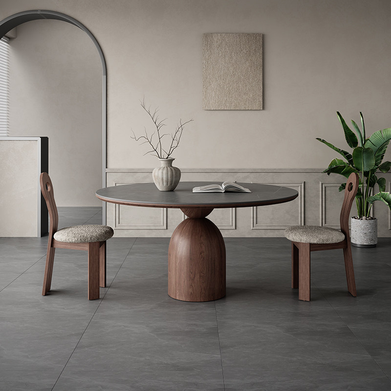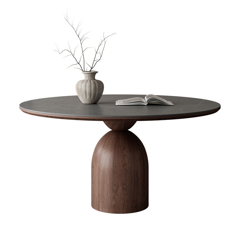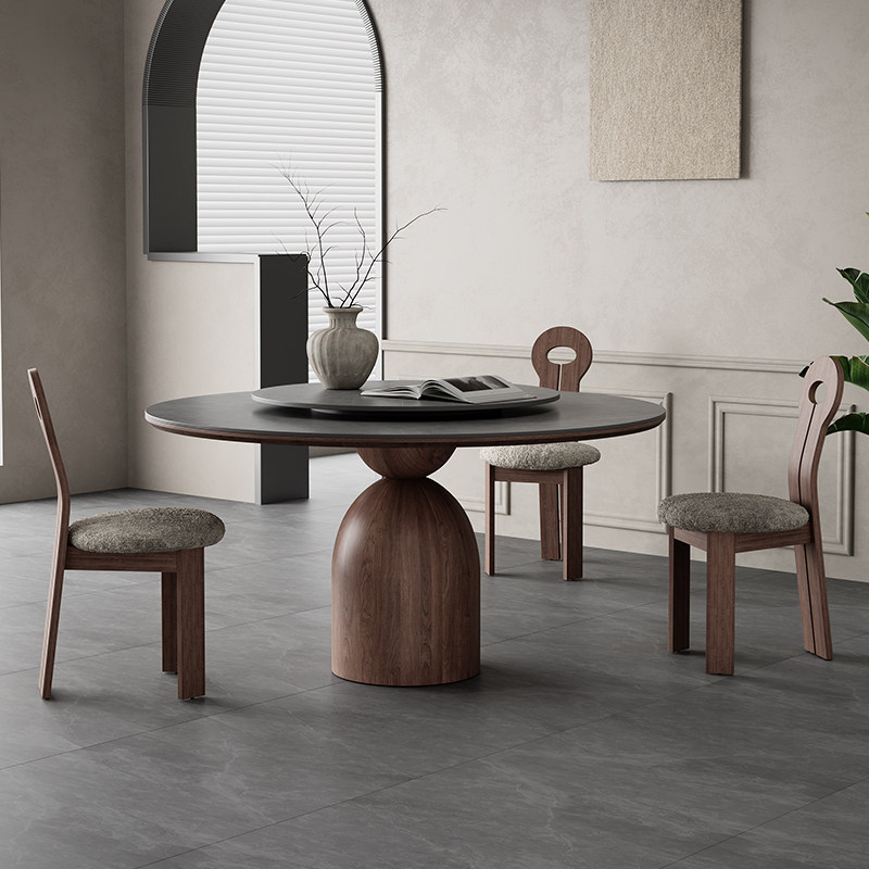 法式复古实木餐桌胡桃木色圆桌家用小户型饭桌侘寂风圆形岩板餐桌