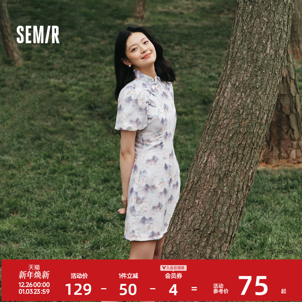 森马连衣裙女水墨画印花泡泡袖盘扣2024夏季新款新中式改良旗袍裙