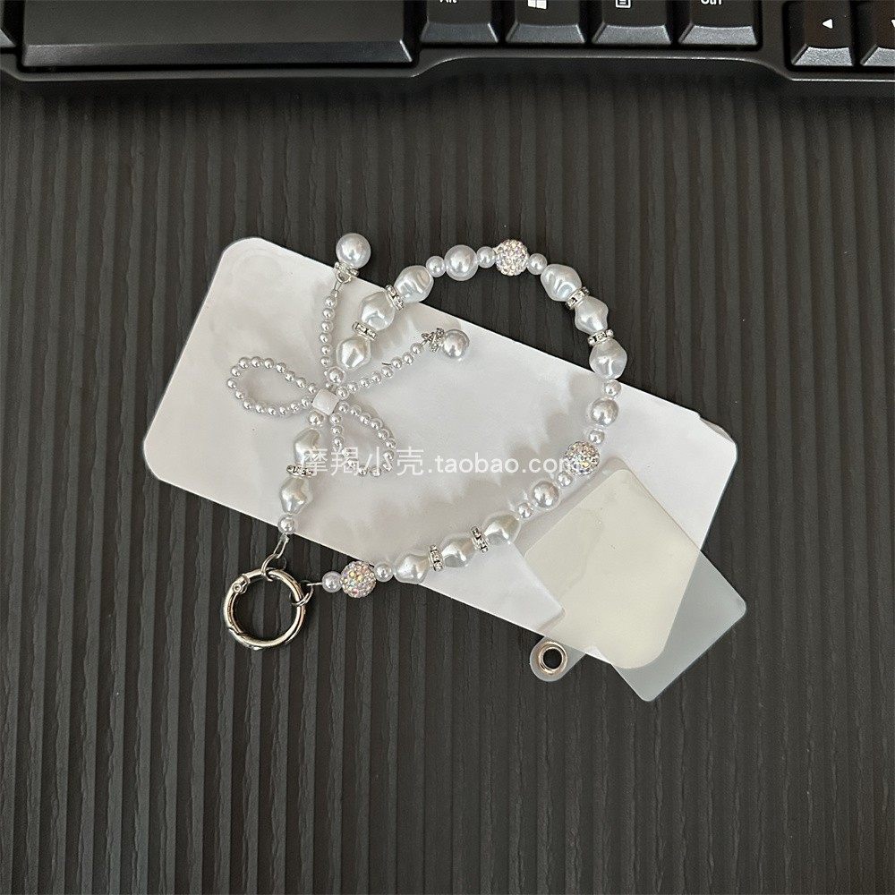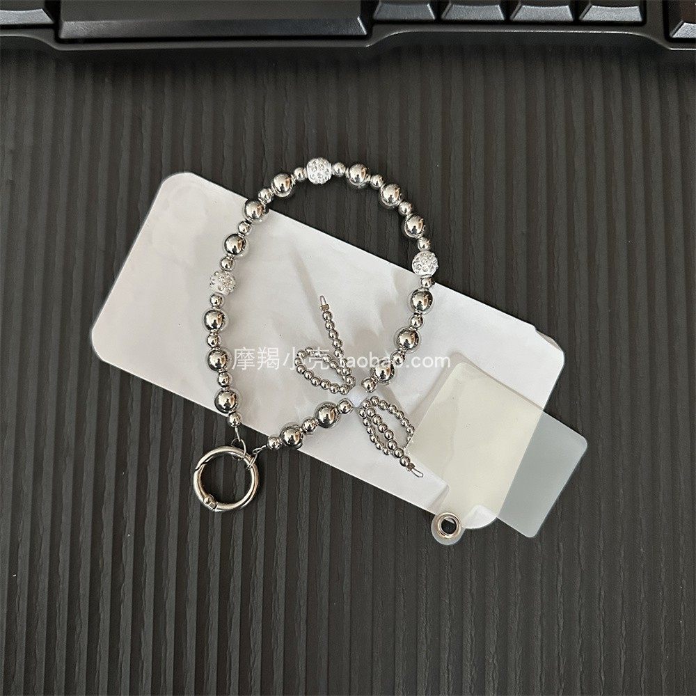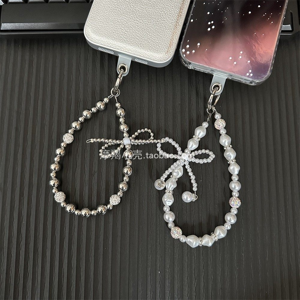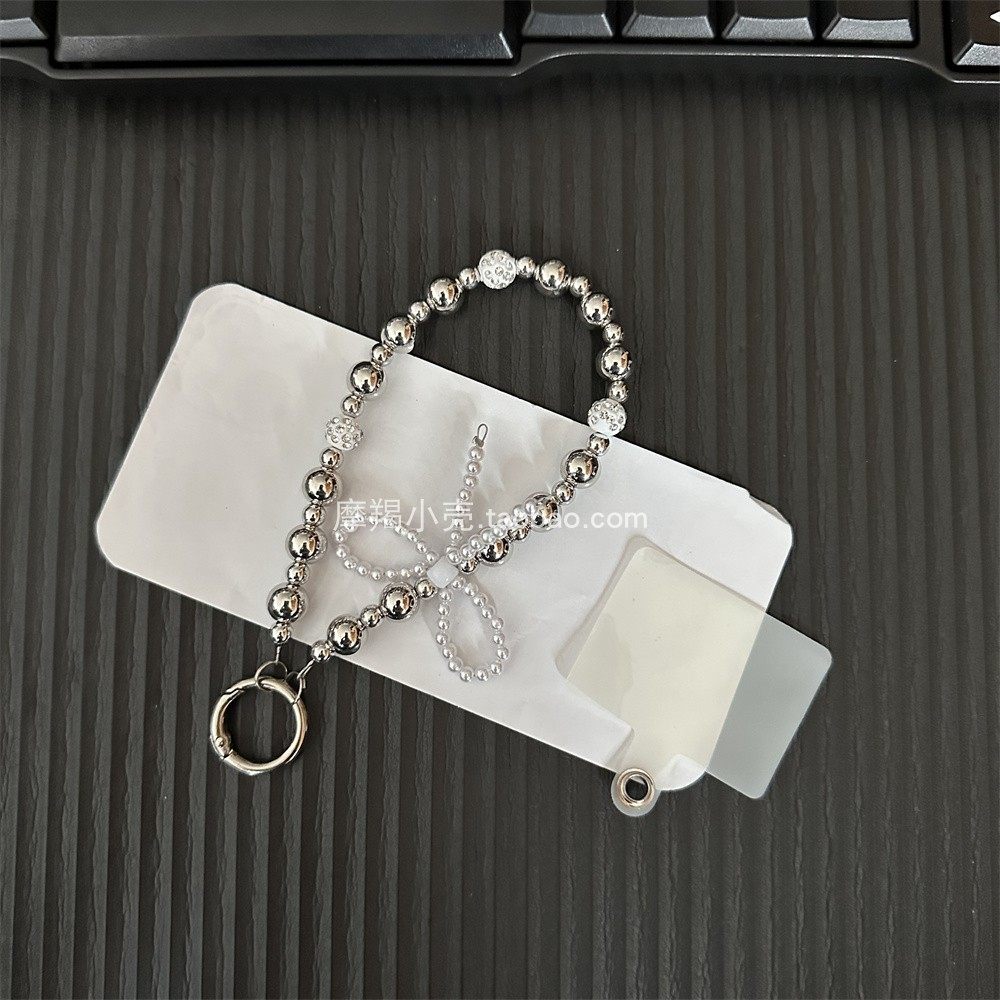 小香风珍珠银珠带钻蝴蝶结手机链条短款手腕绳ccd钥匙扣背包挂链