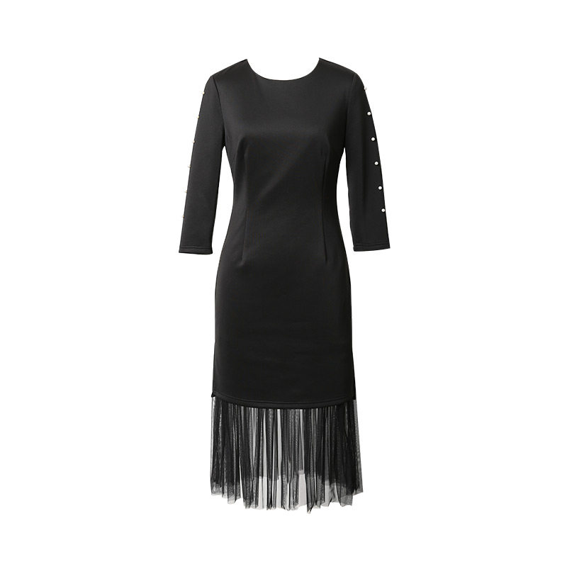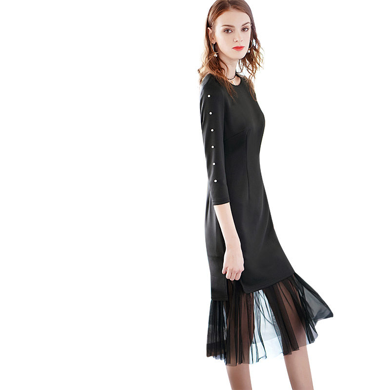 2017春装七分袖圆领显瘦铆钉修身蕾丝边鱼尾连衣裙女