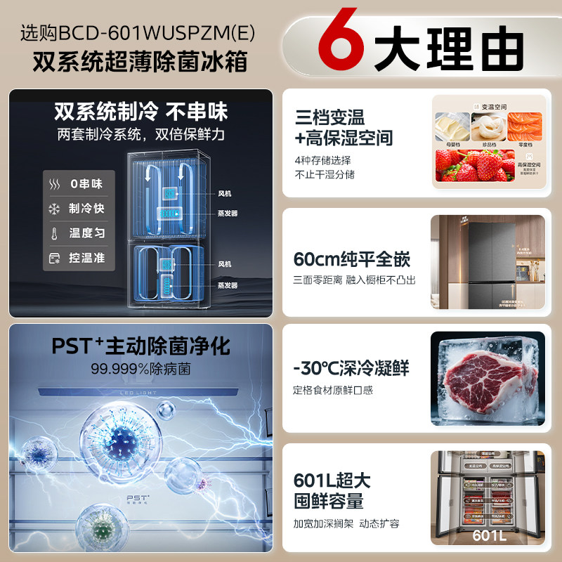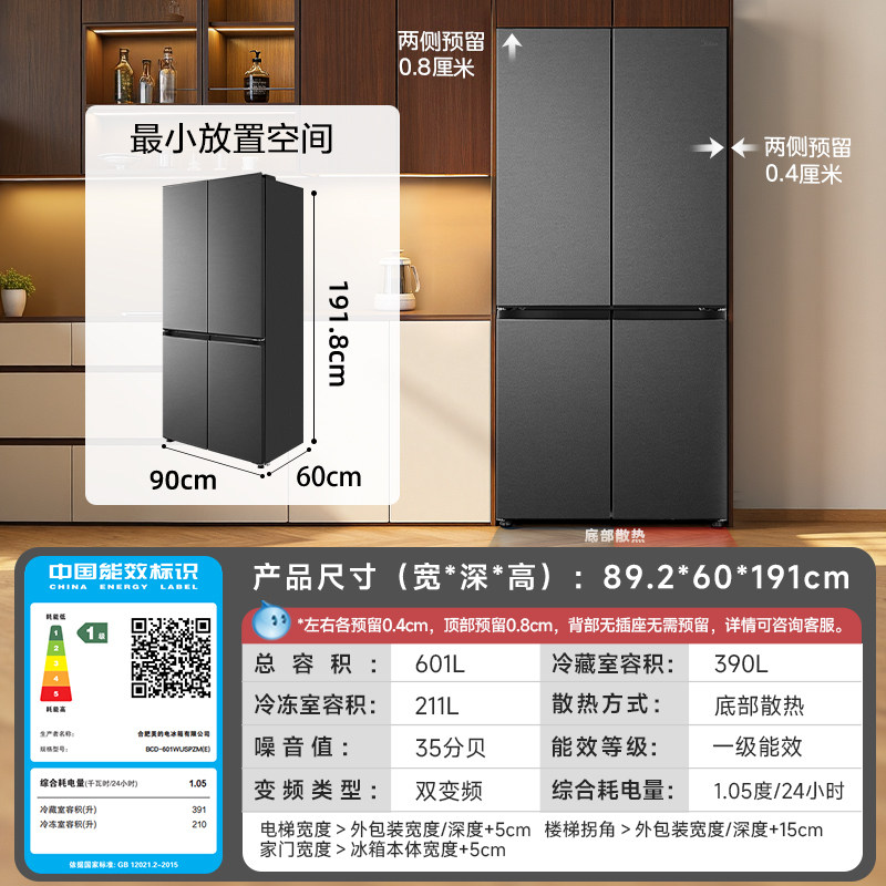 美的熊墩墩601双系统超薄零嵌入式十字四门双开门家用大容量冰箱