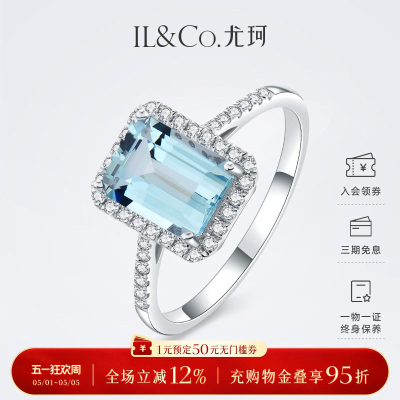 ILCO尤珂「冰蓝方糖」18K金天然海蓝宝石戒指时尚方形彩宝女款戒