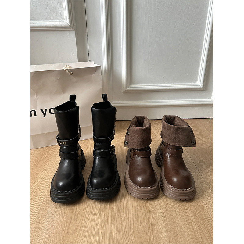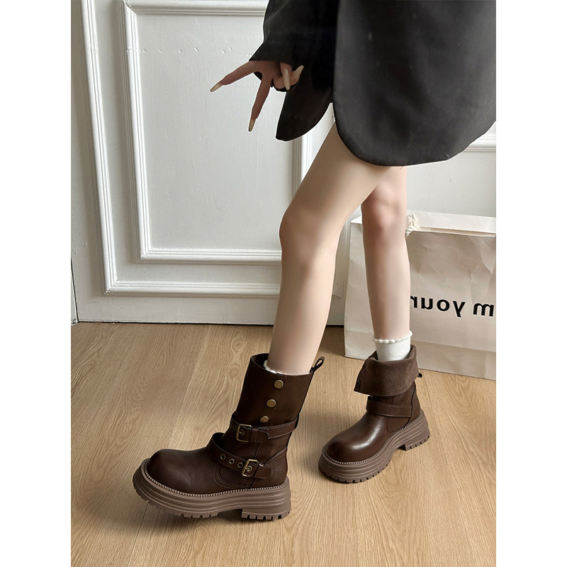 张元英同款皮带扣堆堆靴粗跟复古做旧中筒靴韩版靴子小众工装靴女