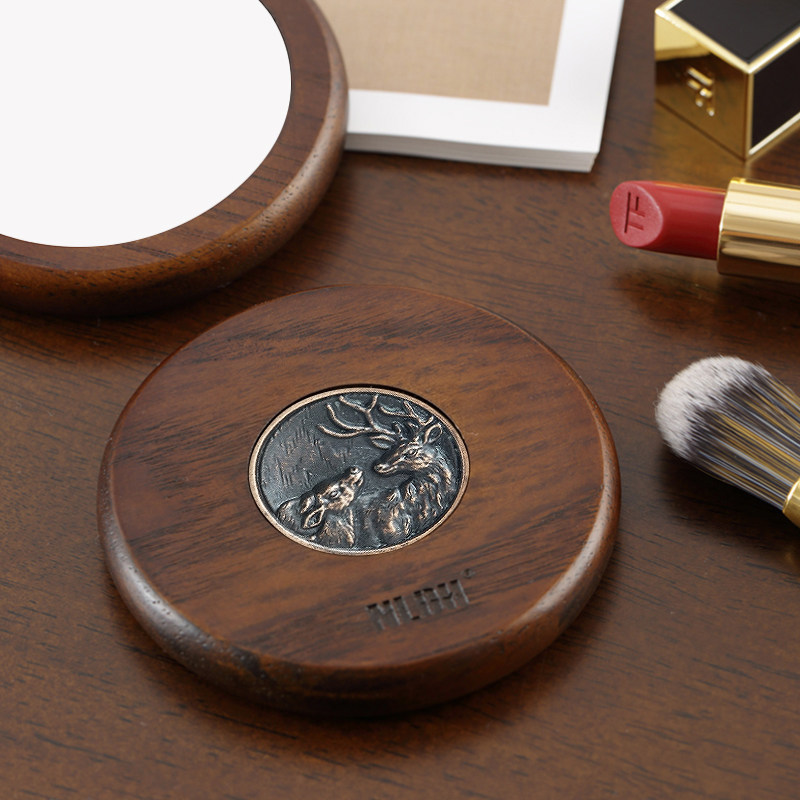 那澜多好实木雕花简约随身镜化妆镜高清便携梳妆镜圆形单面小圆镜