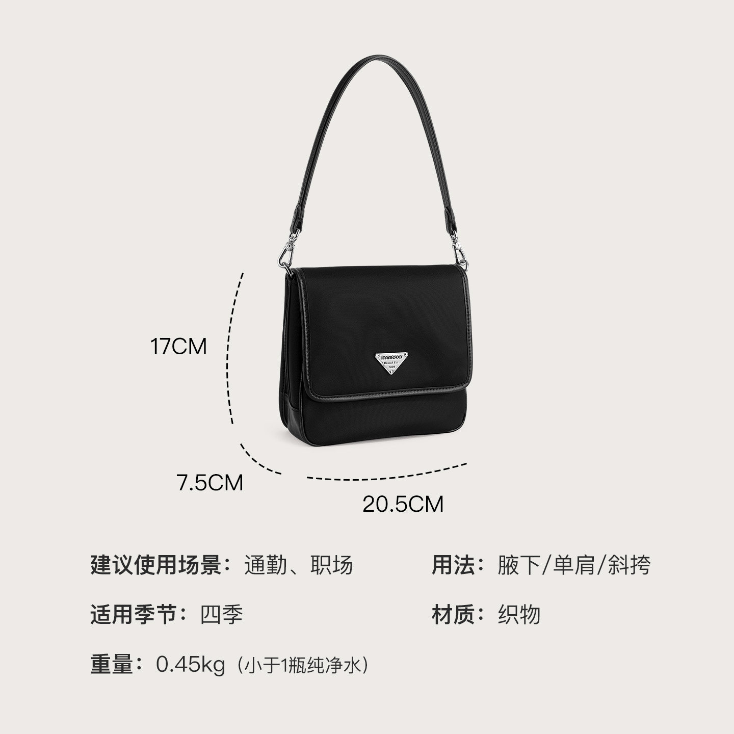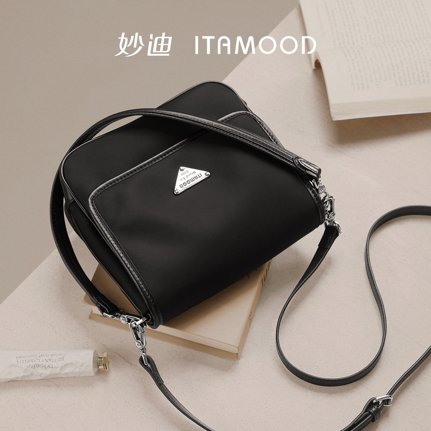 妙迪尼龙配牛皮手提袋新款黑色包包轻软时尚休闲腋下包斜挎邮差女