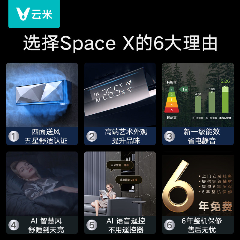 云米空调1.5匹全域风家用智能语音新一级能效变频冷暖两用Space X