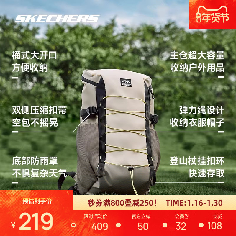 斯凯奇户外包男女款多功能双肩包防雨大容量桶式登山徒步轻便背包