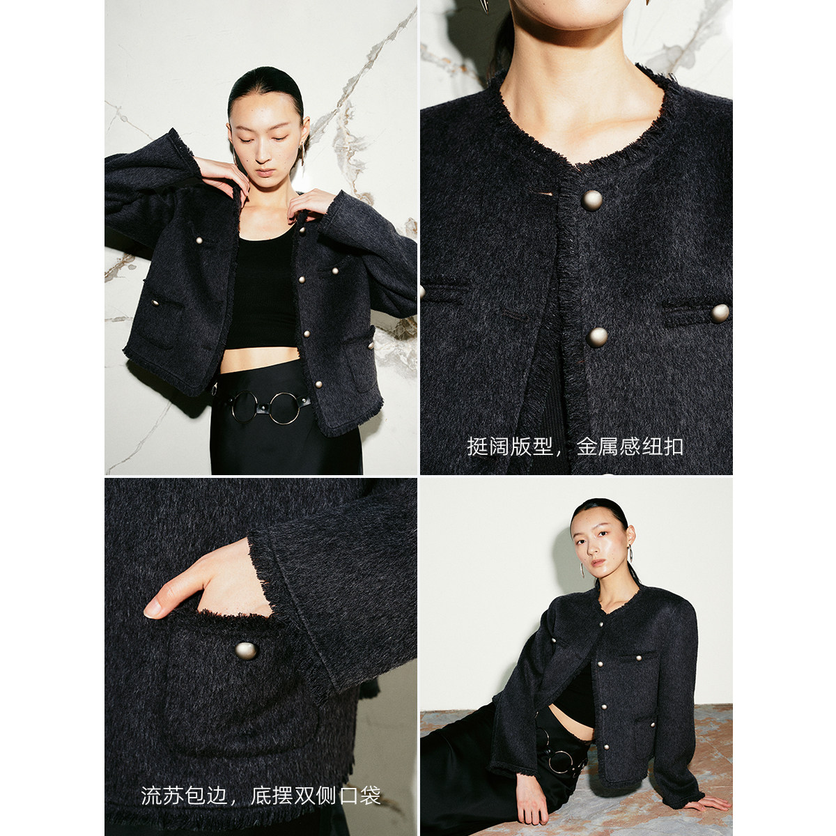 流苏包边 细节丰富;金属感纽扣 贵气加持