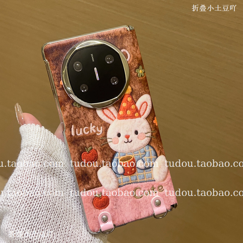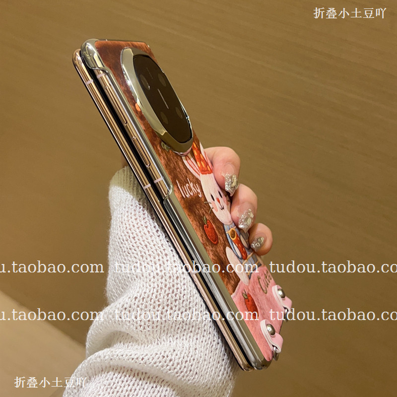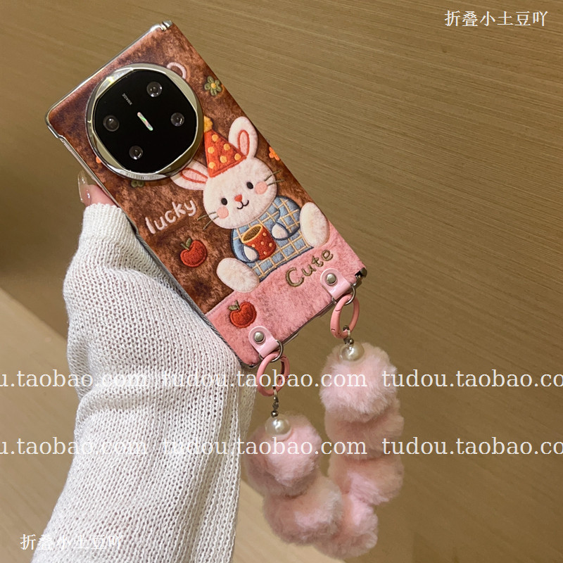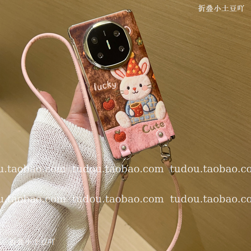 新品秋冬粉棕兔子适用vivoxfold5手机壳中轴磁吸matex7/6保护套maigcv6手提vs3斜挎oppofindn6典藏版挂绳女款