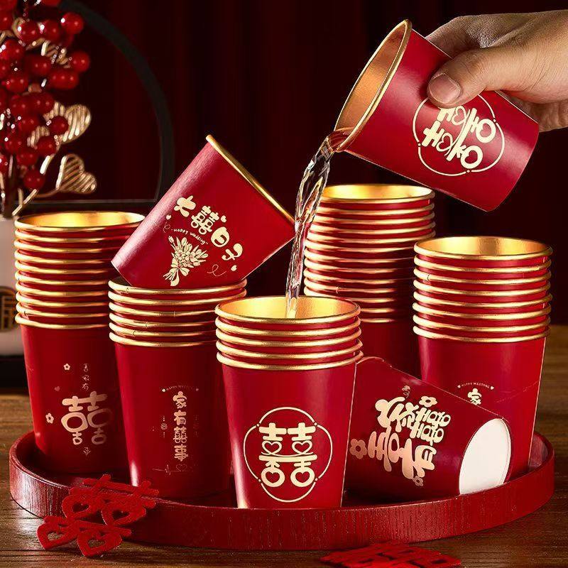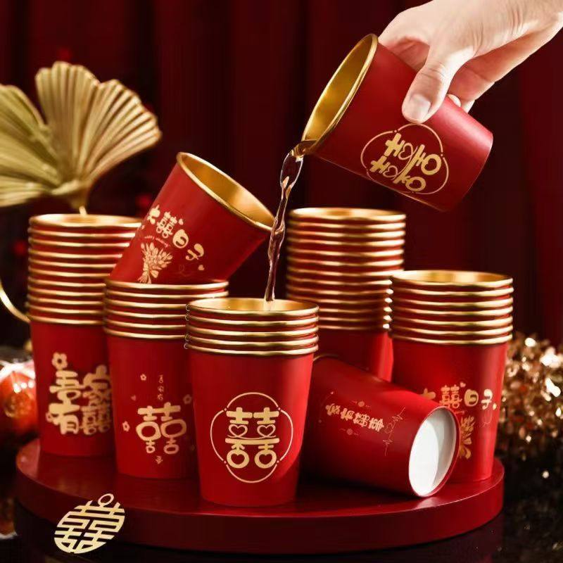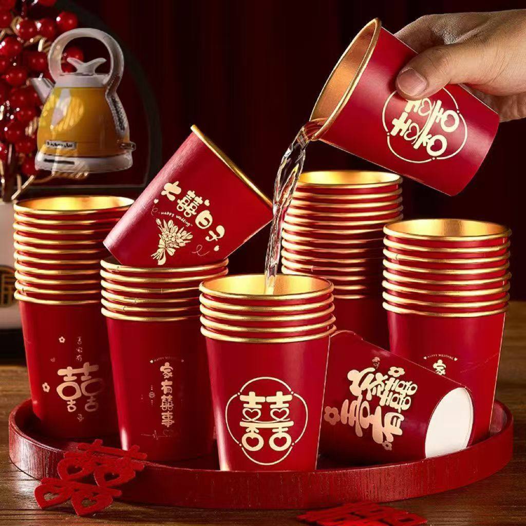 结婚纸杯一次性喜杯子婚礼用品大全婚庆订婚家用婚宴红色加厚水杯