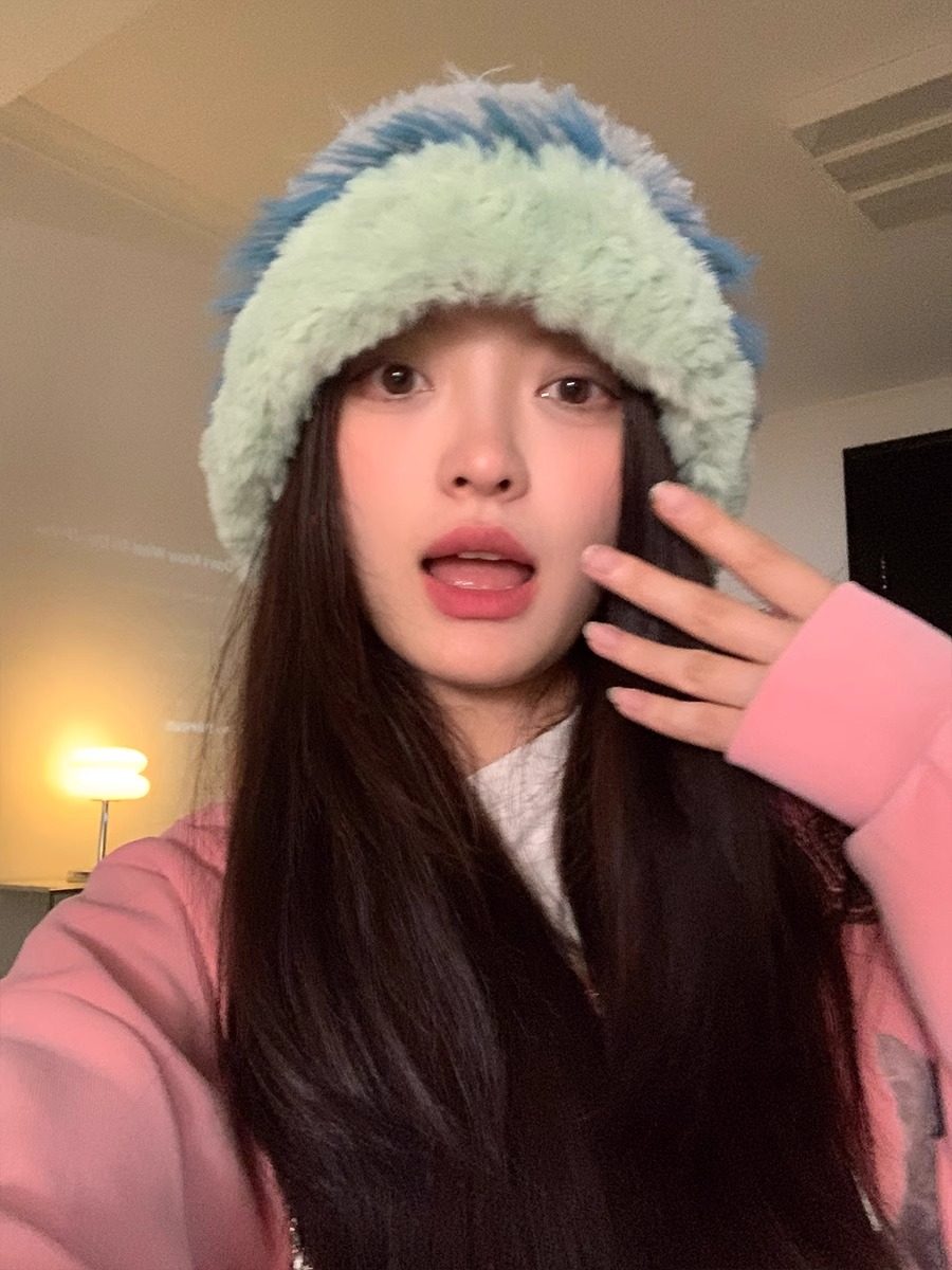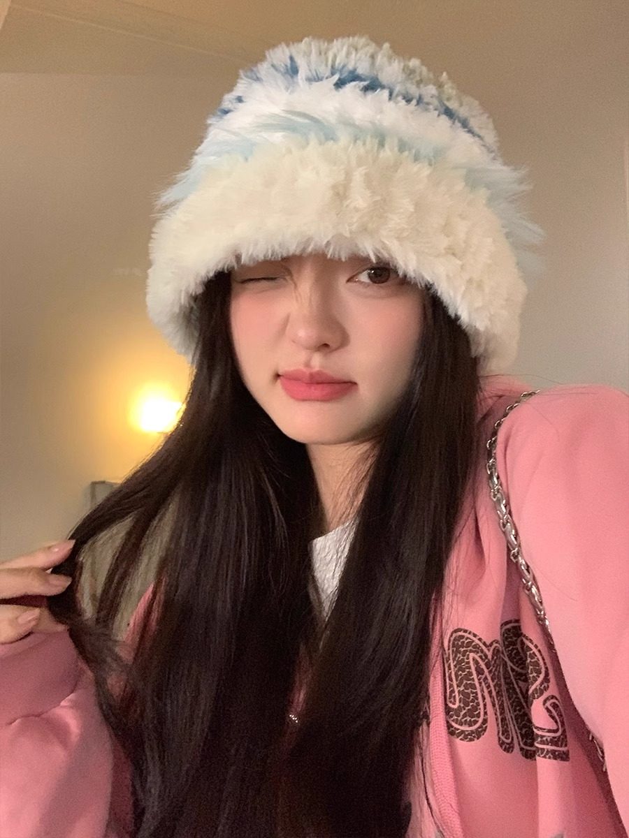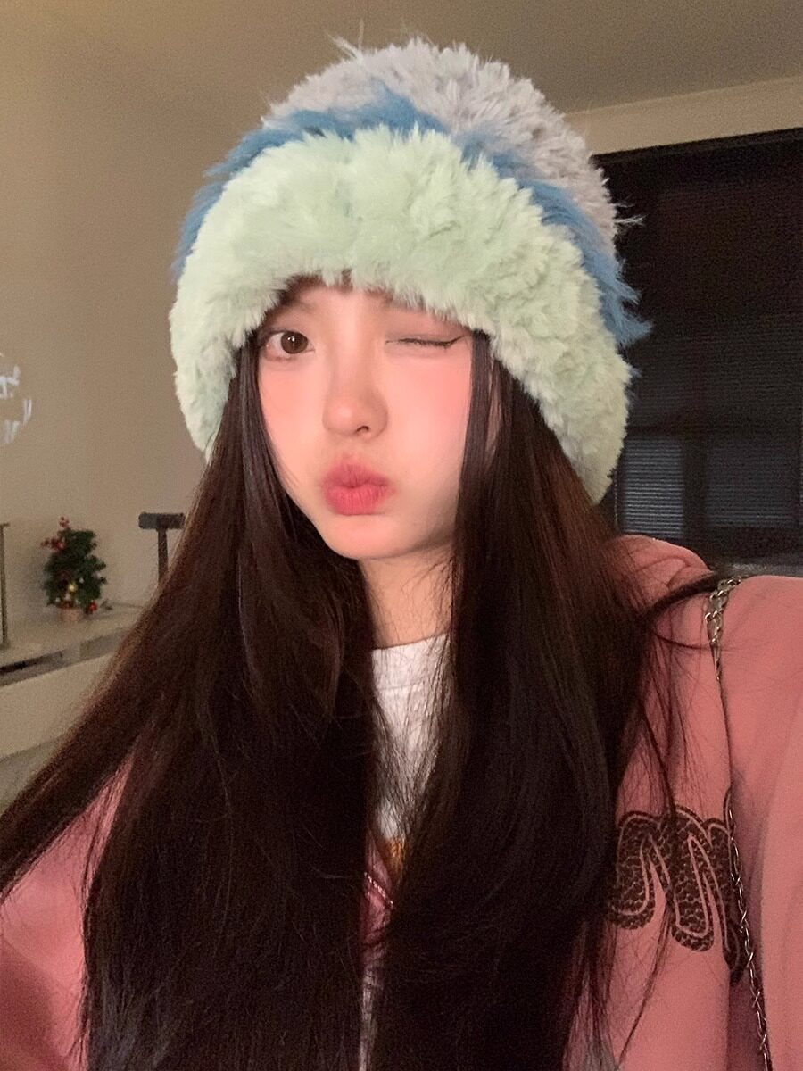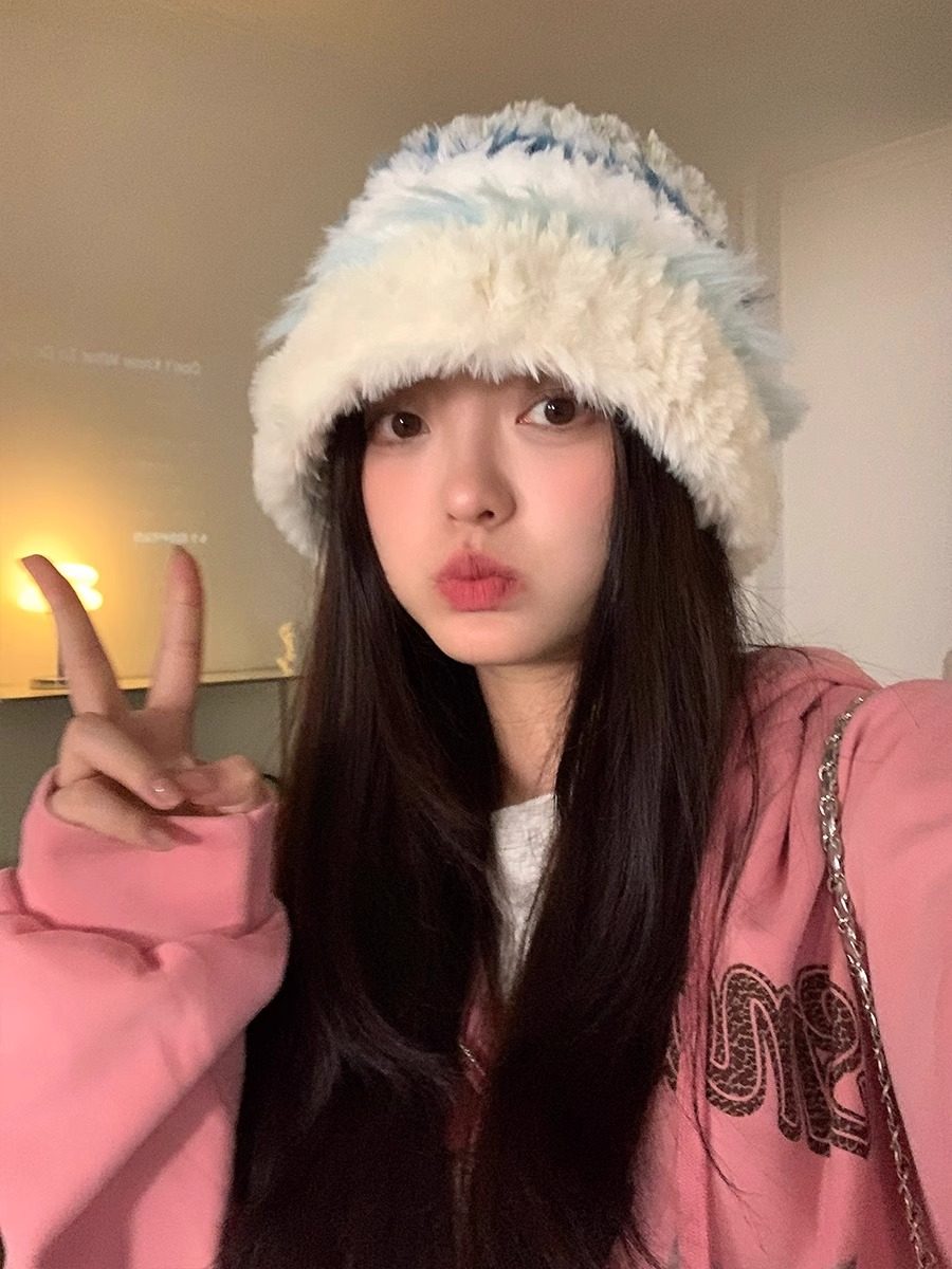 日系毛绒渔夫帽子女秋冬季显脸小彩色兔毛针织帽大头围保暖毛线帽