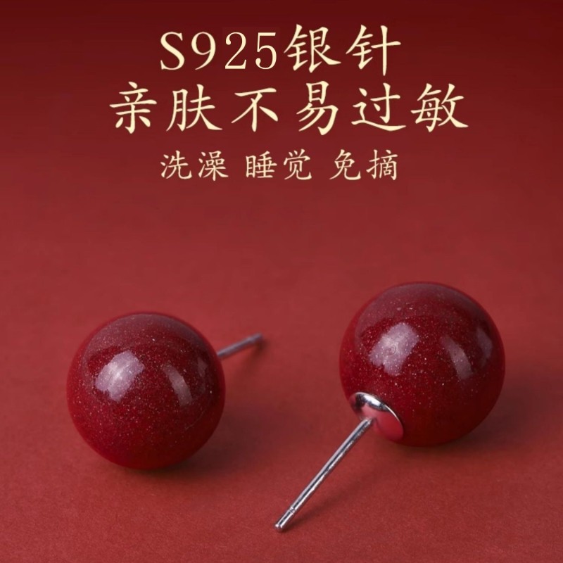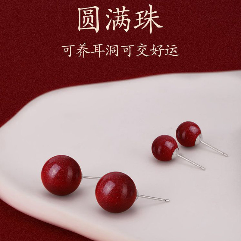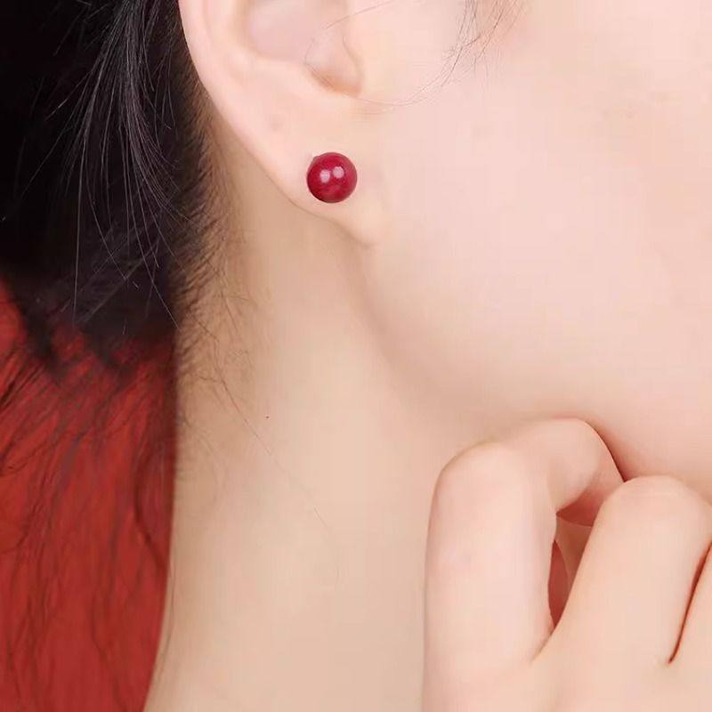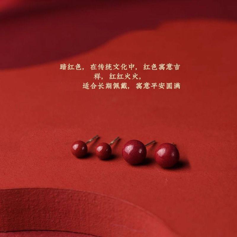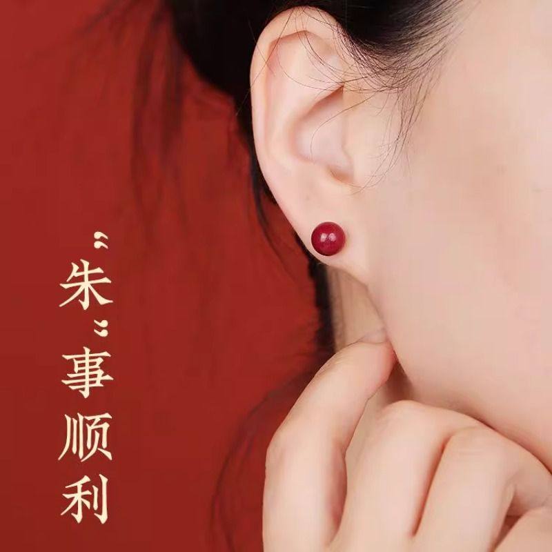 S925银针耳钉女士红色本命年耳环小众轻奢养耳洞纯银豆豆耳饰好运