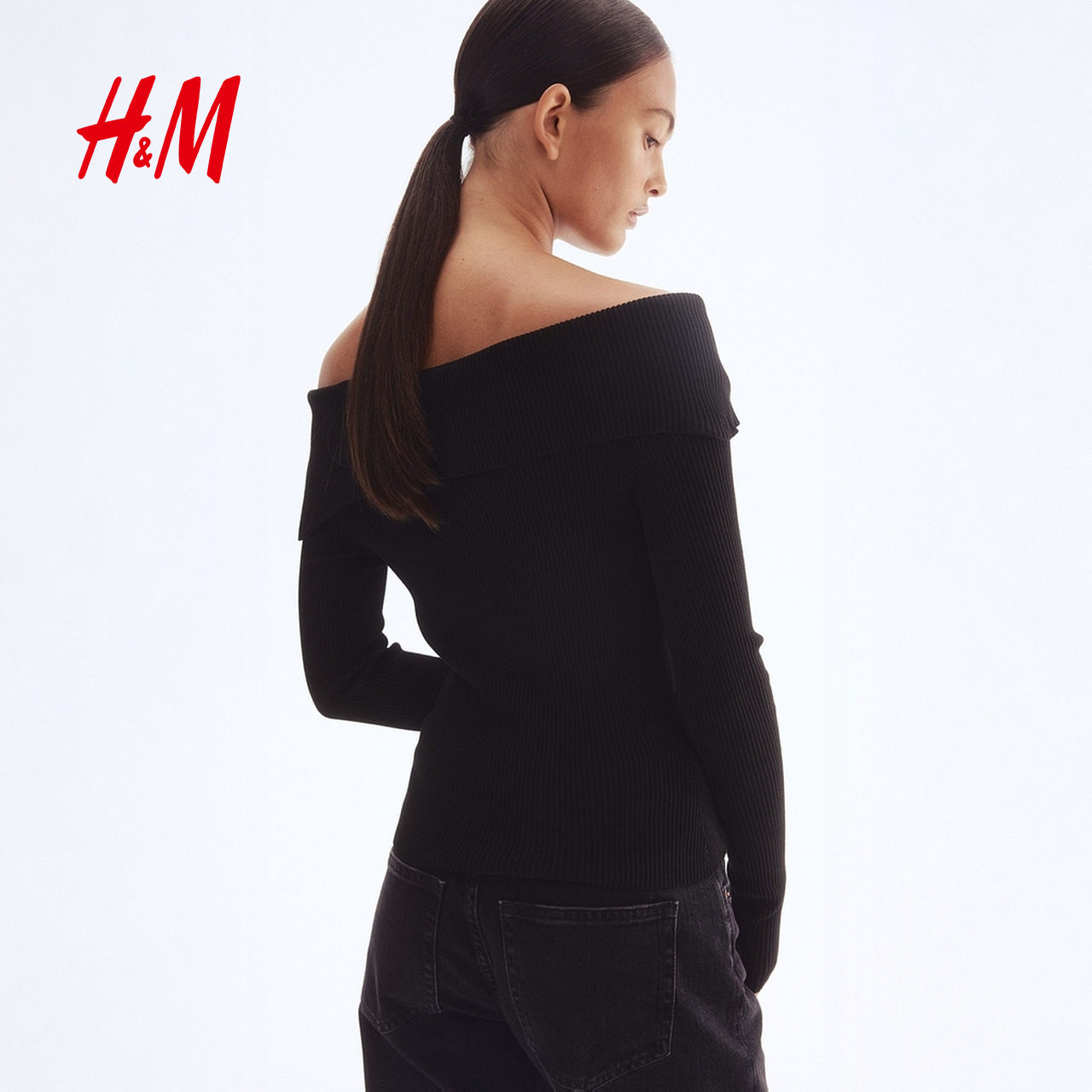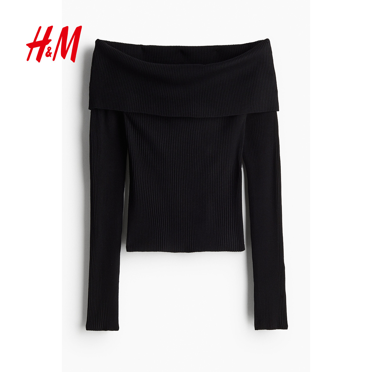 HM女装毛针织衫春季优雅修身露肩一字肩打底毛衣1237775