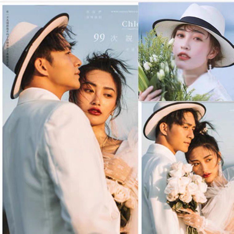 森系旅拍婚纱摄影 写真拍摄主题影楼黑丝带白礼帽 街拍道具爵士帽
