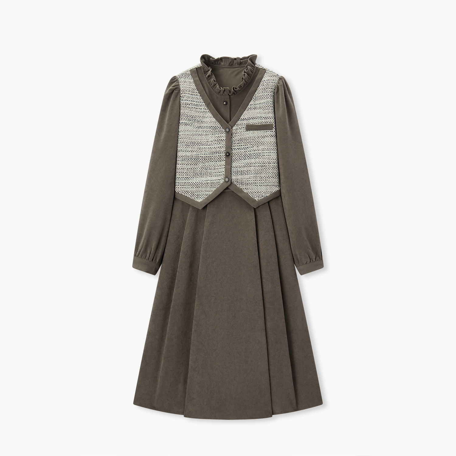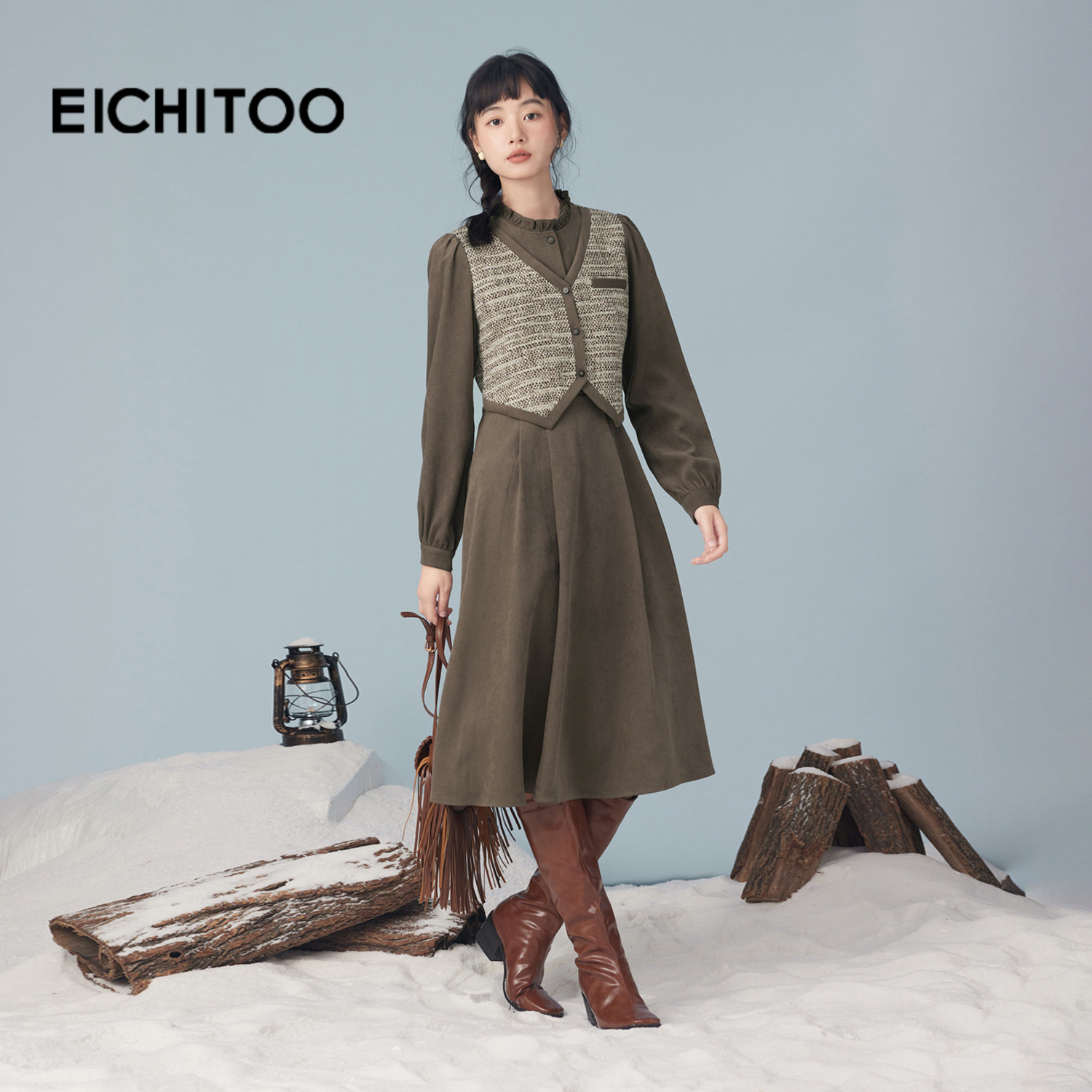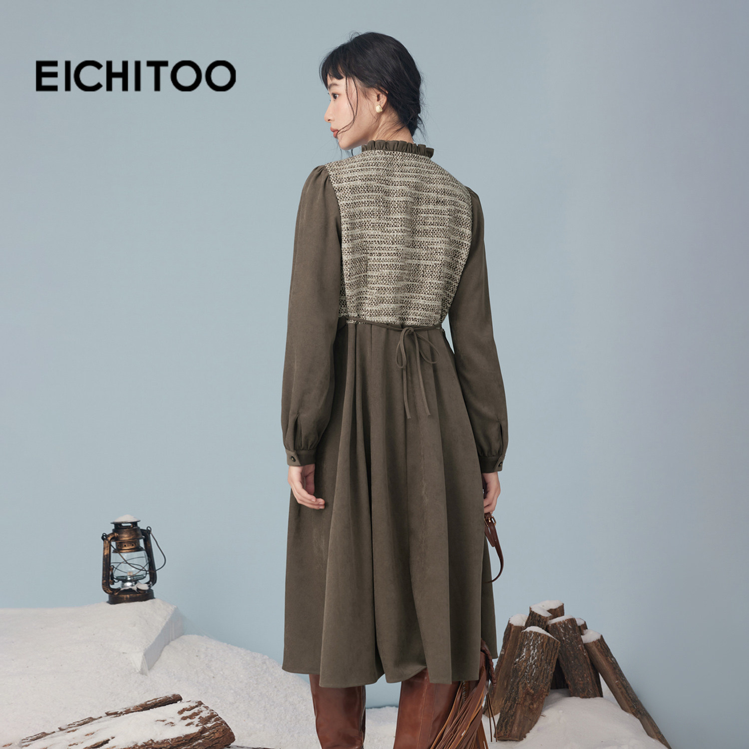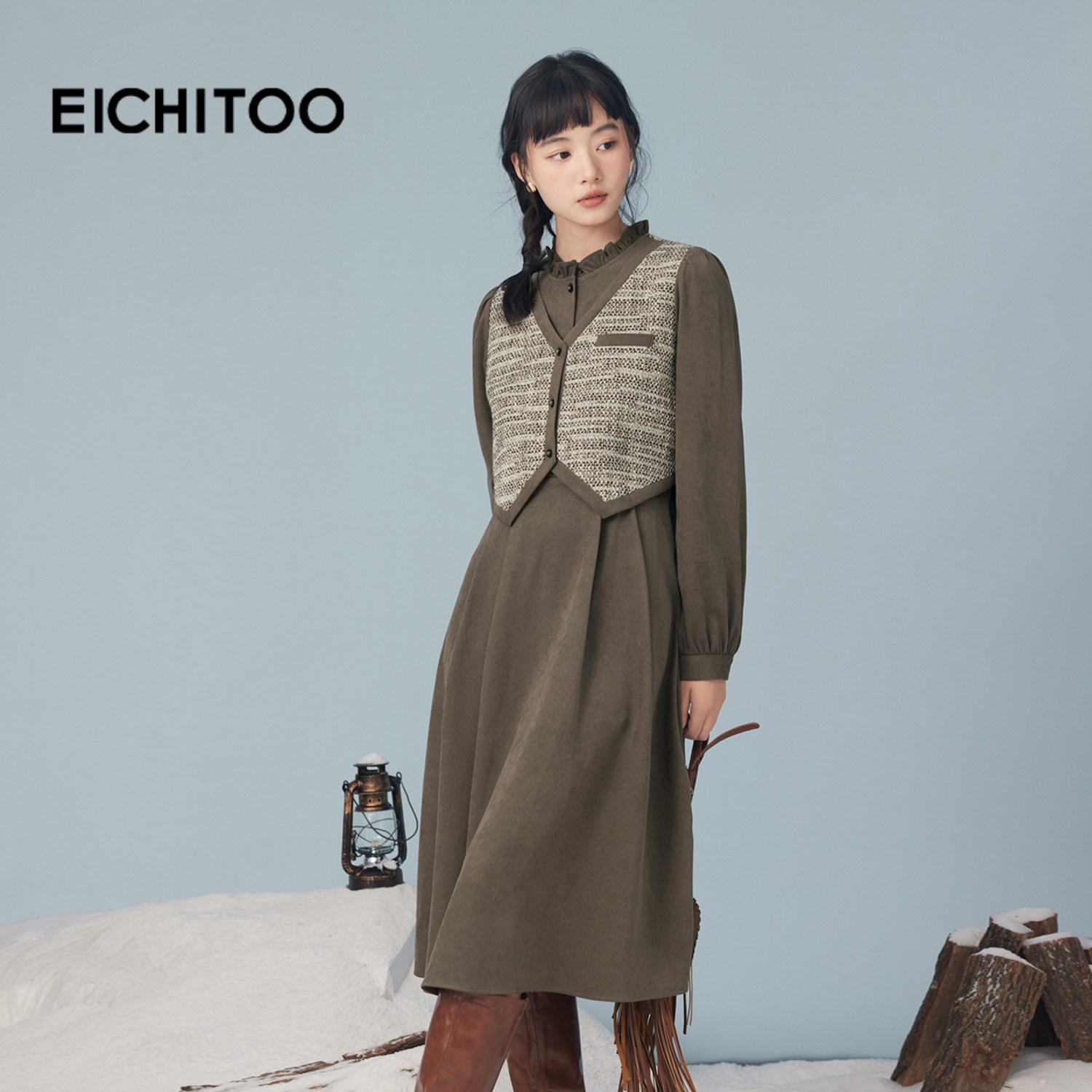 爱居兔新款磨毛拼接设计小香风连衣裙2025年冬季新款女长裙