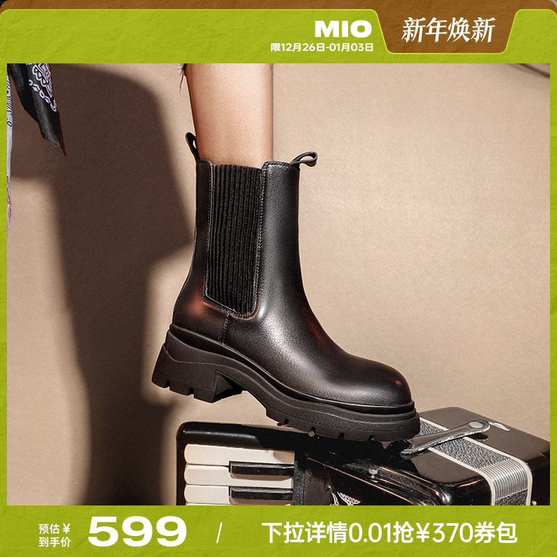 MIO米奥冬季靴子圆头中筒复古短靴厚底黑色切尔西靴潮流女靴