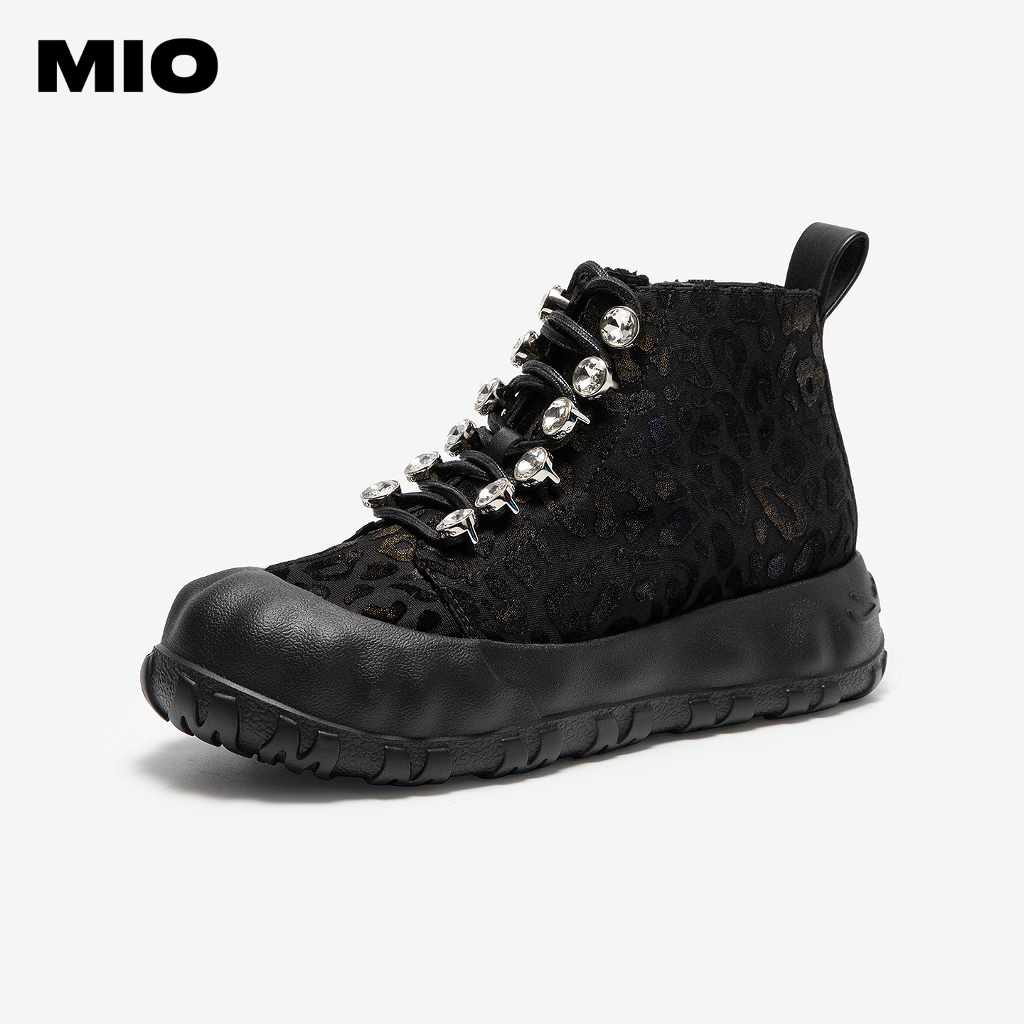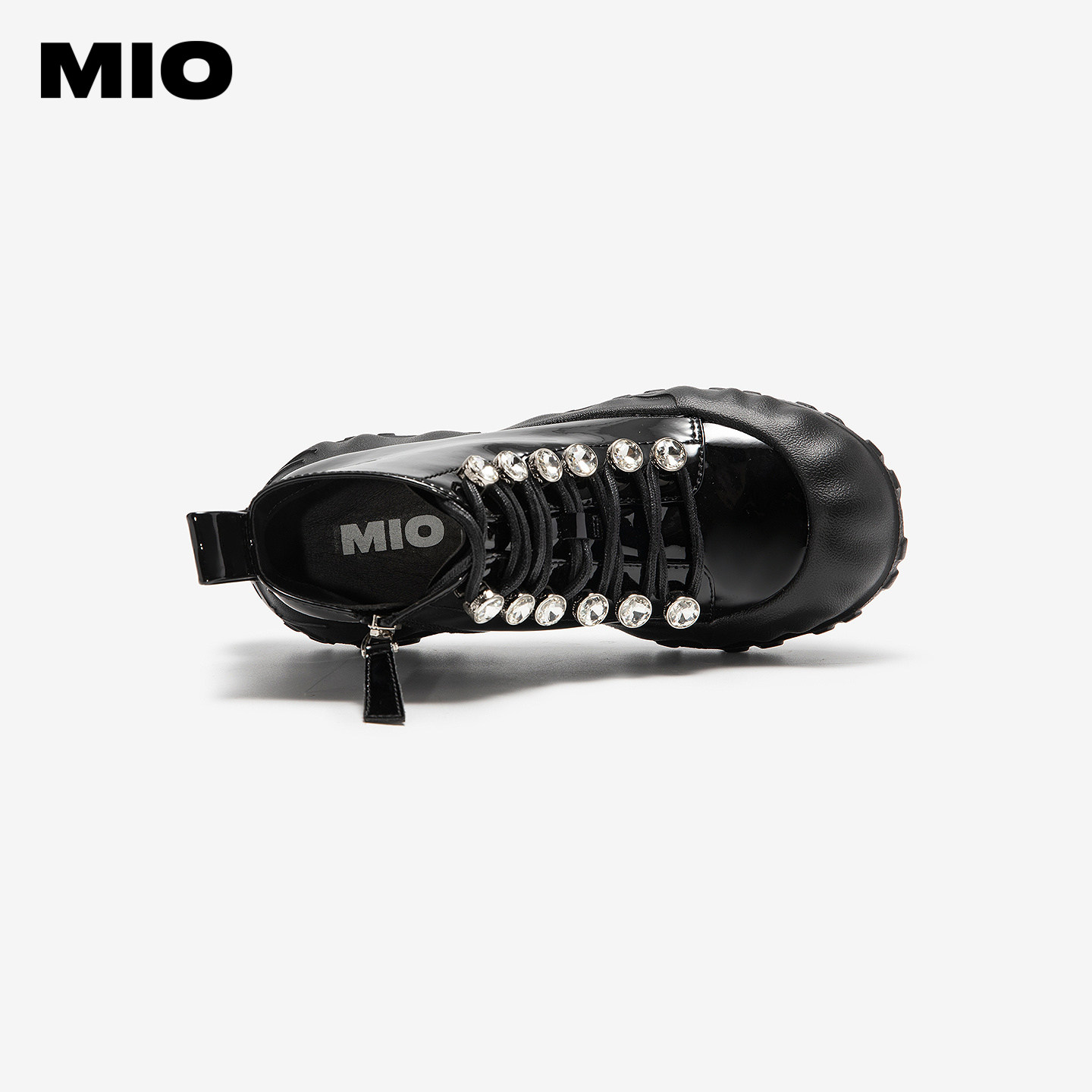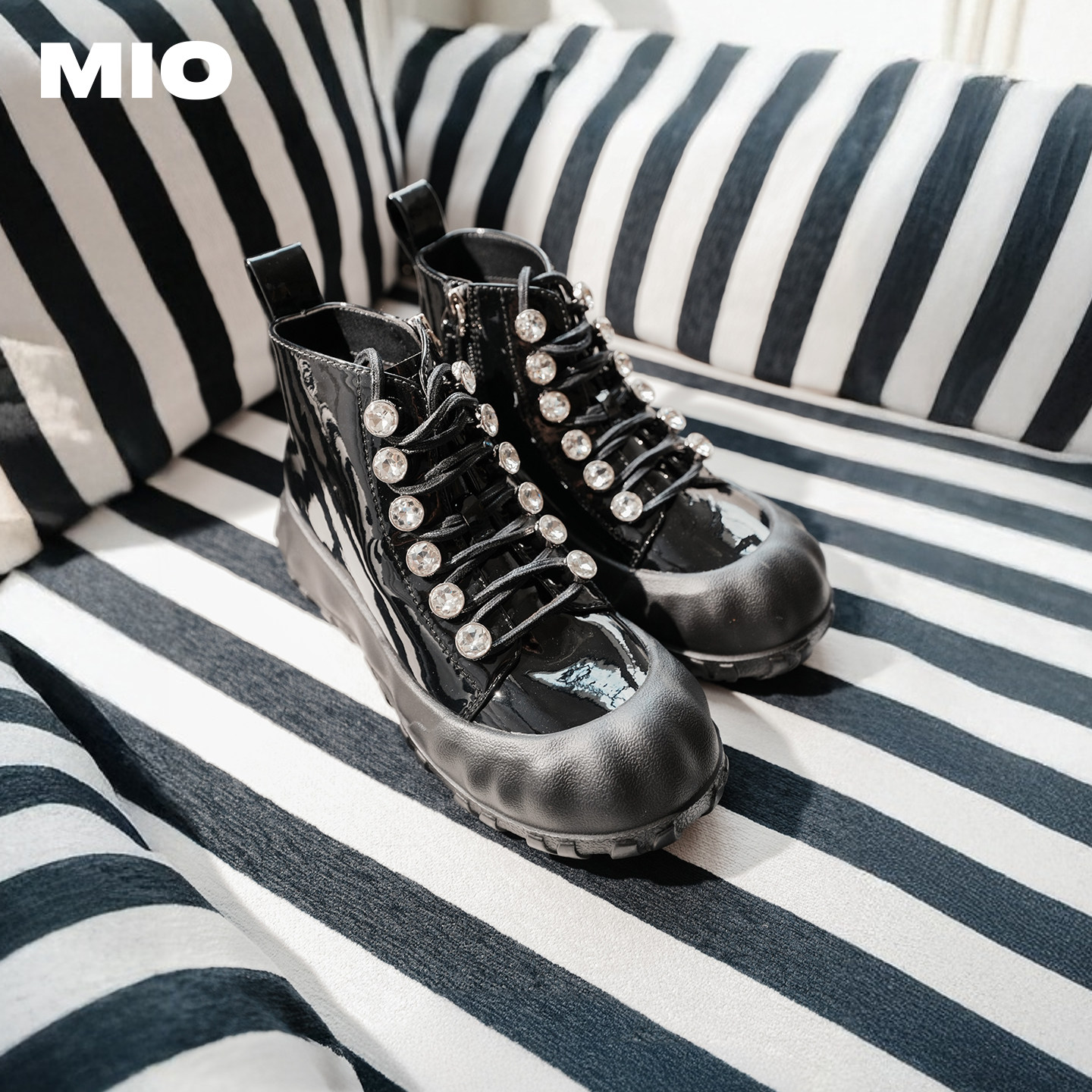 MIO米奥马丁靴2025冬季新款圆头厚底钻饰绑带纯黑短筒时尚女靴