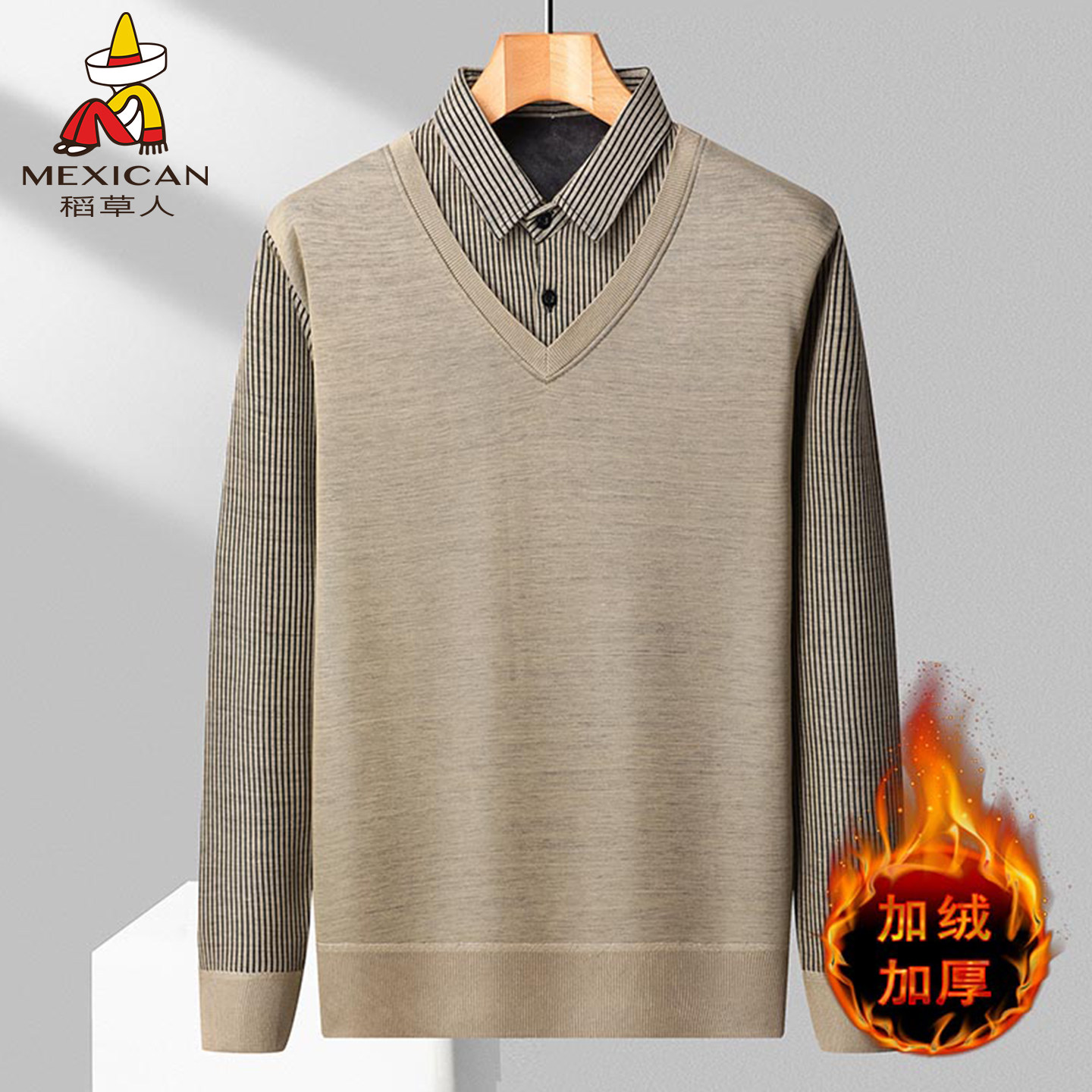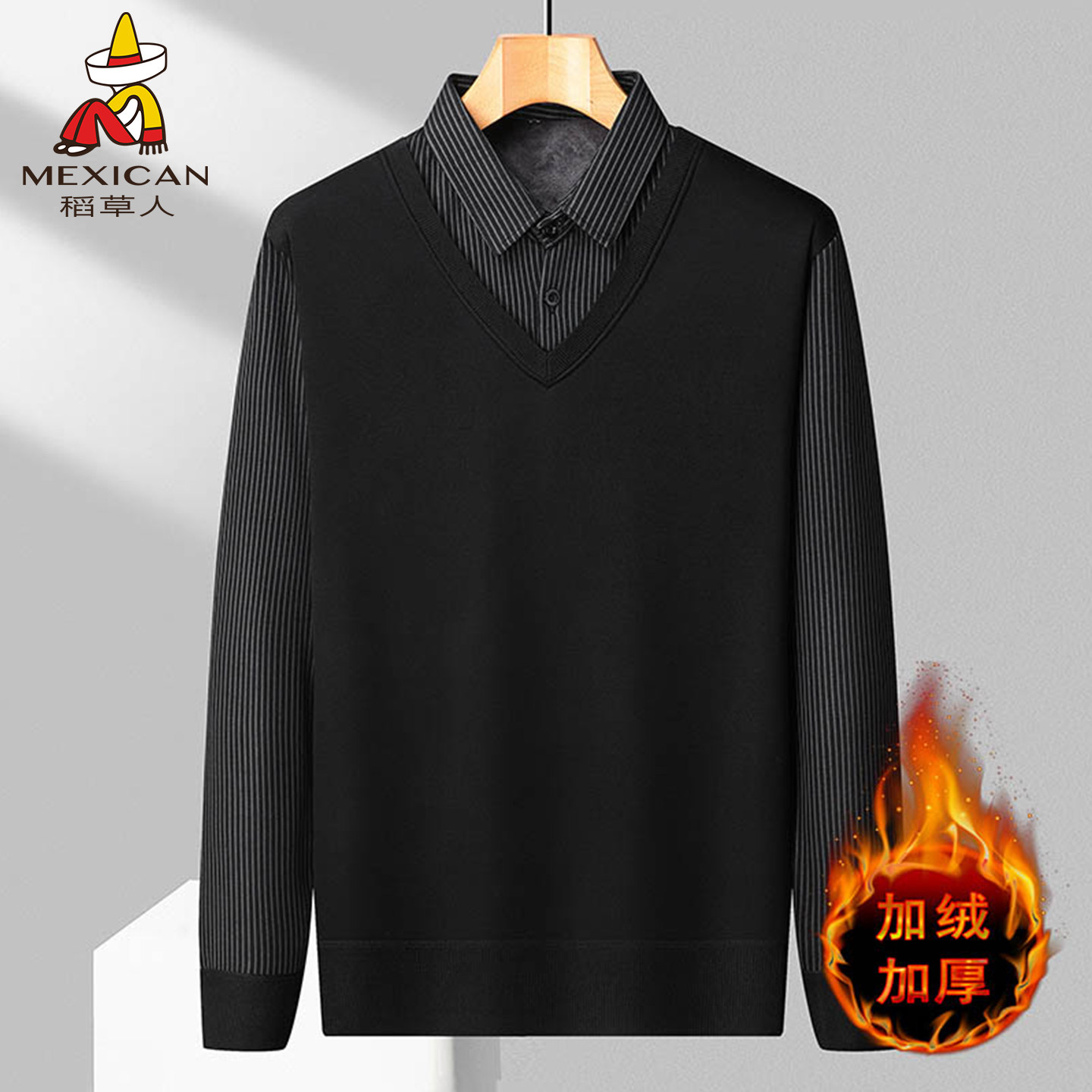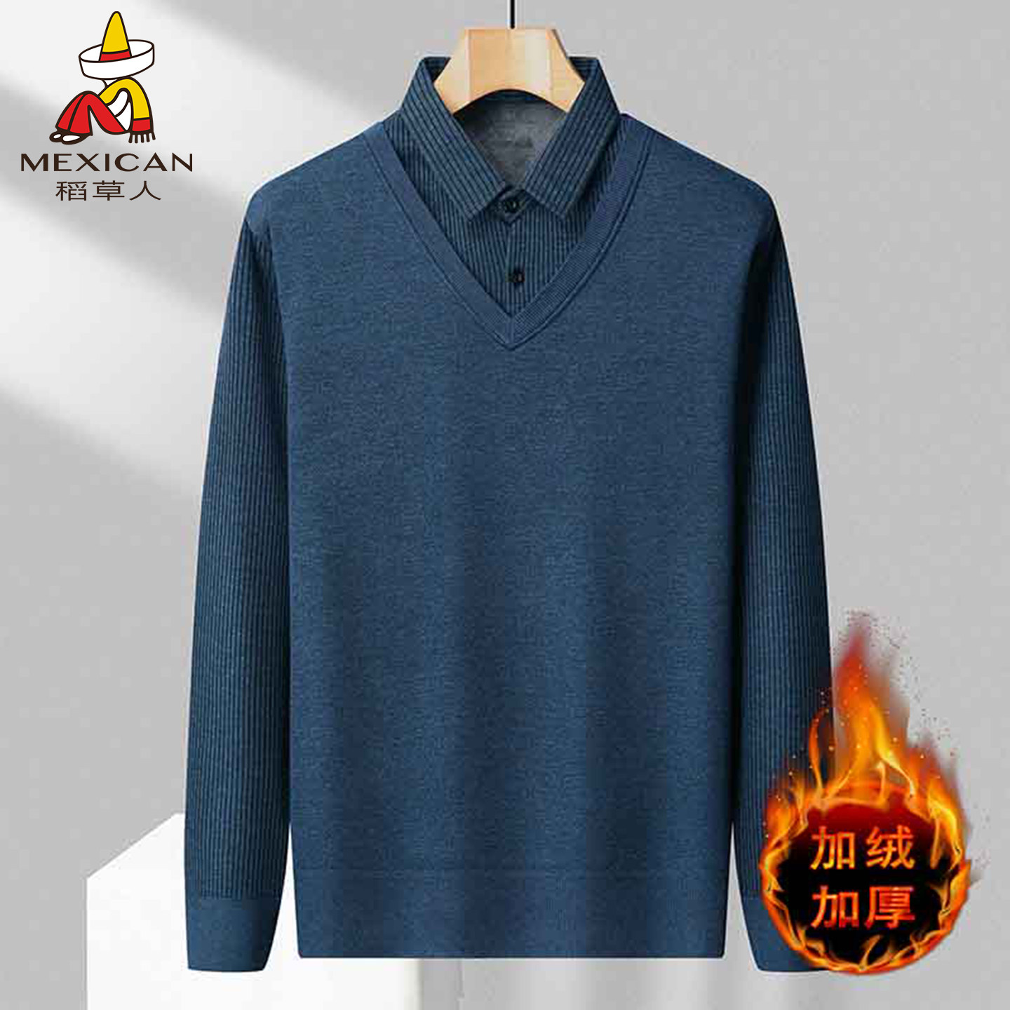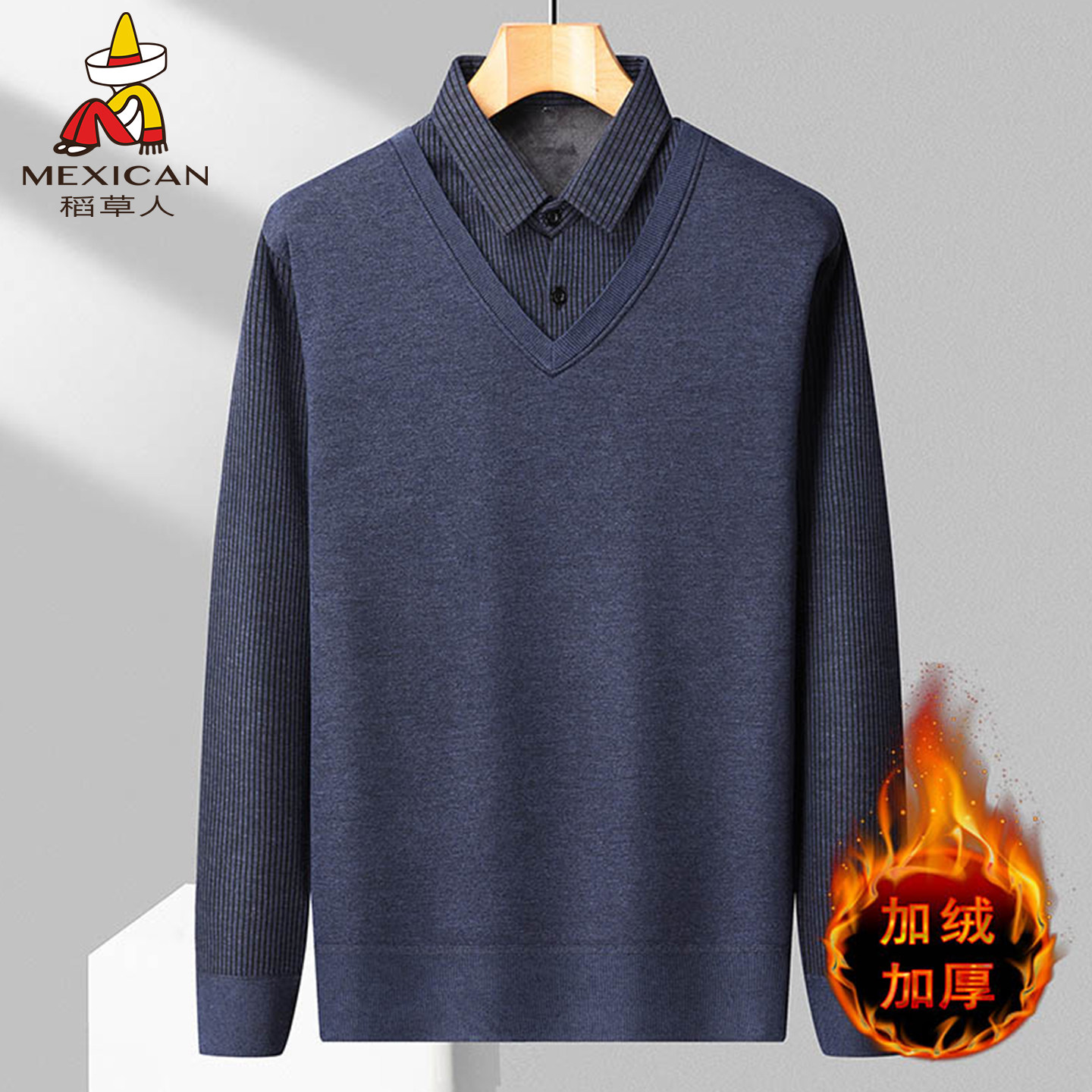 稻草人假两件毛衣男士秋冬季新款中年爸爸装打底衫加绒针织上衣J