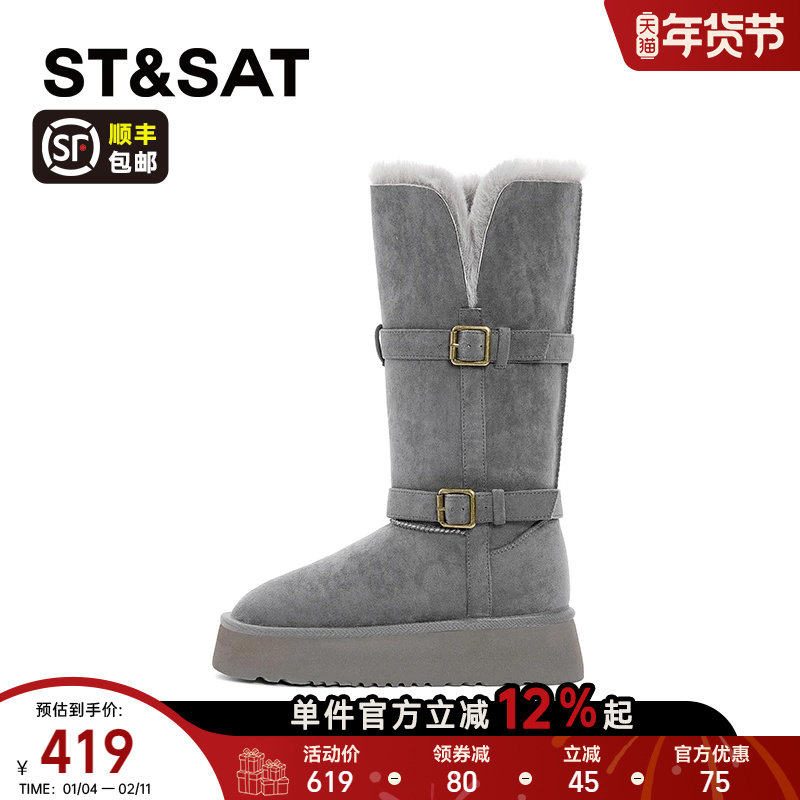 星期六灰色长筒雪地靴女款2025新款冬季加绒加厚高筒棉靴厚底长靴