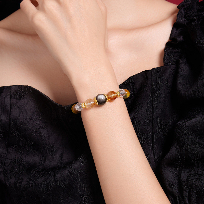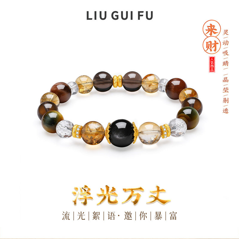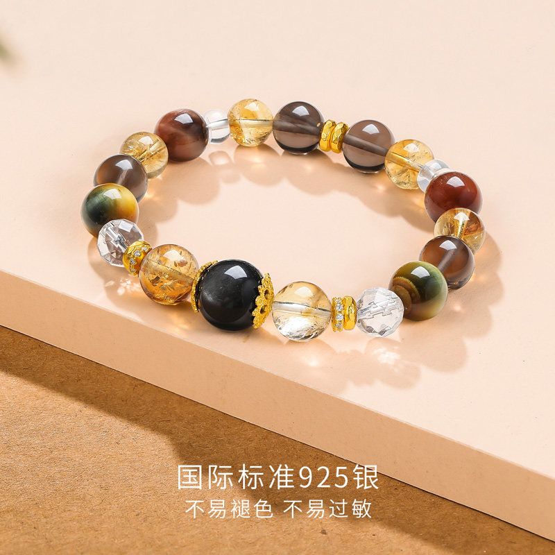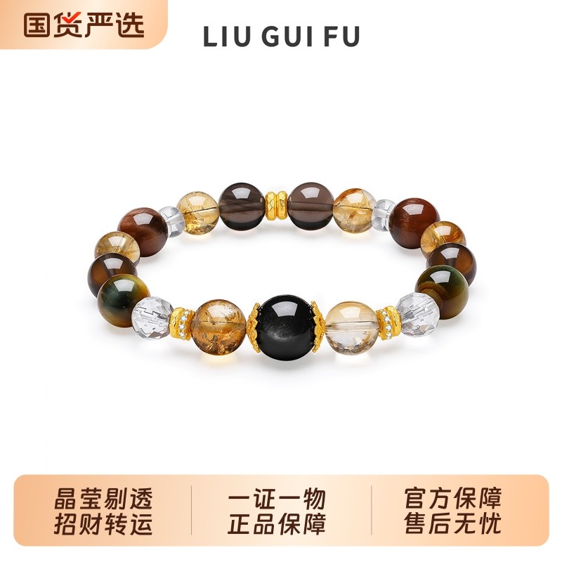 六桂福珠宝黄水晶转运珠S925纯银黑耀虎眼石手串圣诞礼物送女友