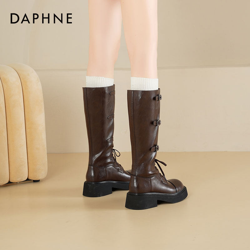 达芙妮厚底长筒靴子女秋冬2026新款棕色长靴美拉德皮带扣骑士靴女