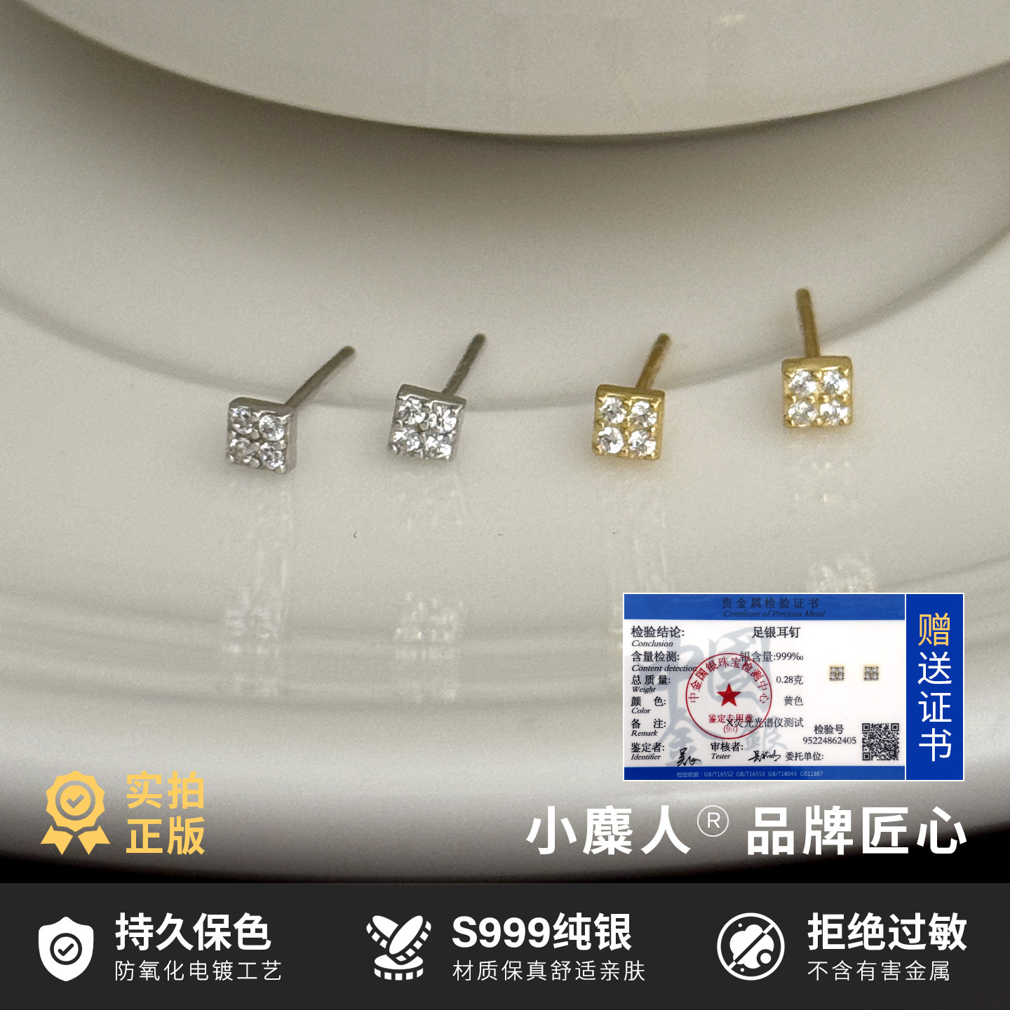 小麋人999纯银小方块小巧简约耳钉男女耳环耳饰韩国金色方形通勤