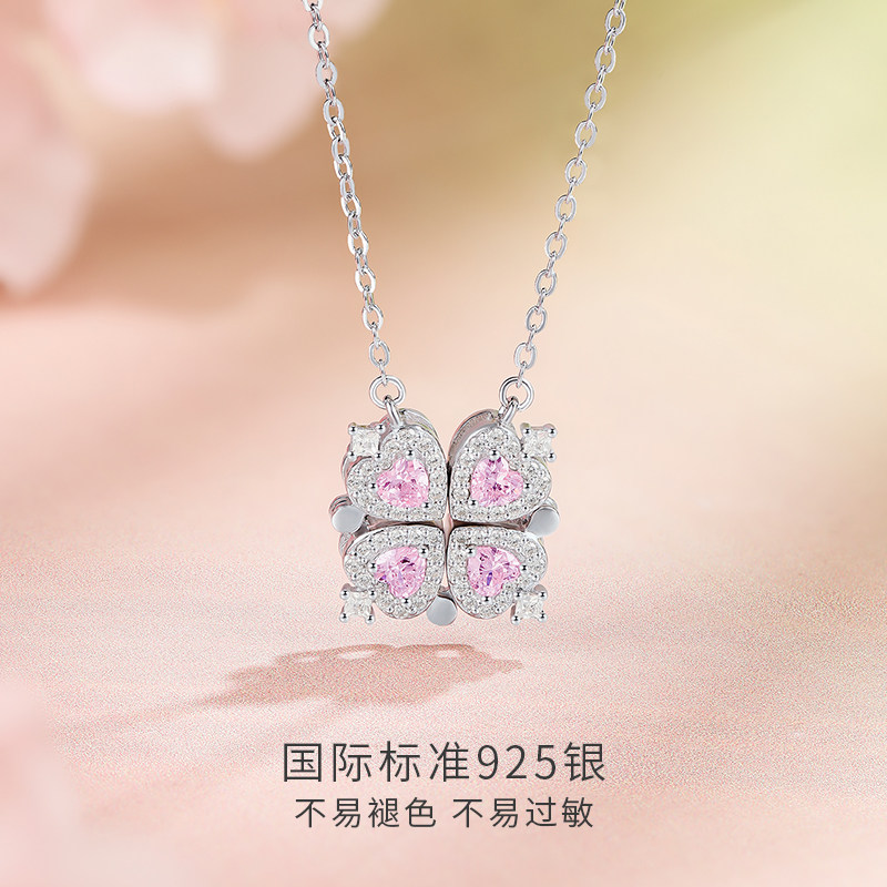 六桂福珠宝S925银新款两戴心连心开合四叶草爱心折叠项链圣诞礼物