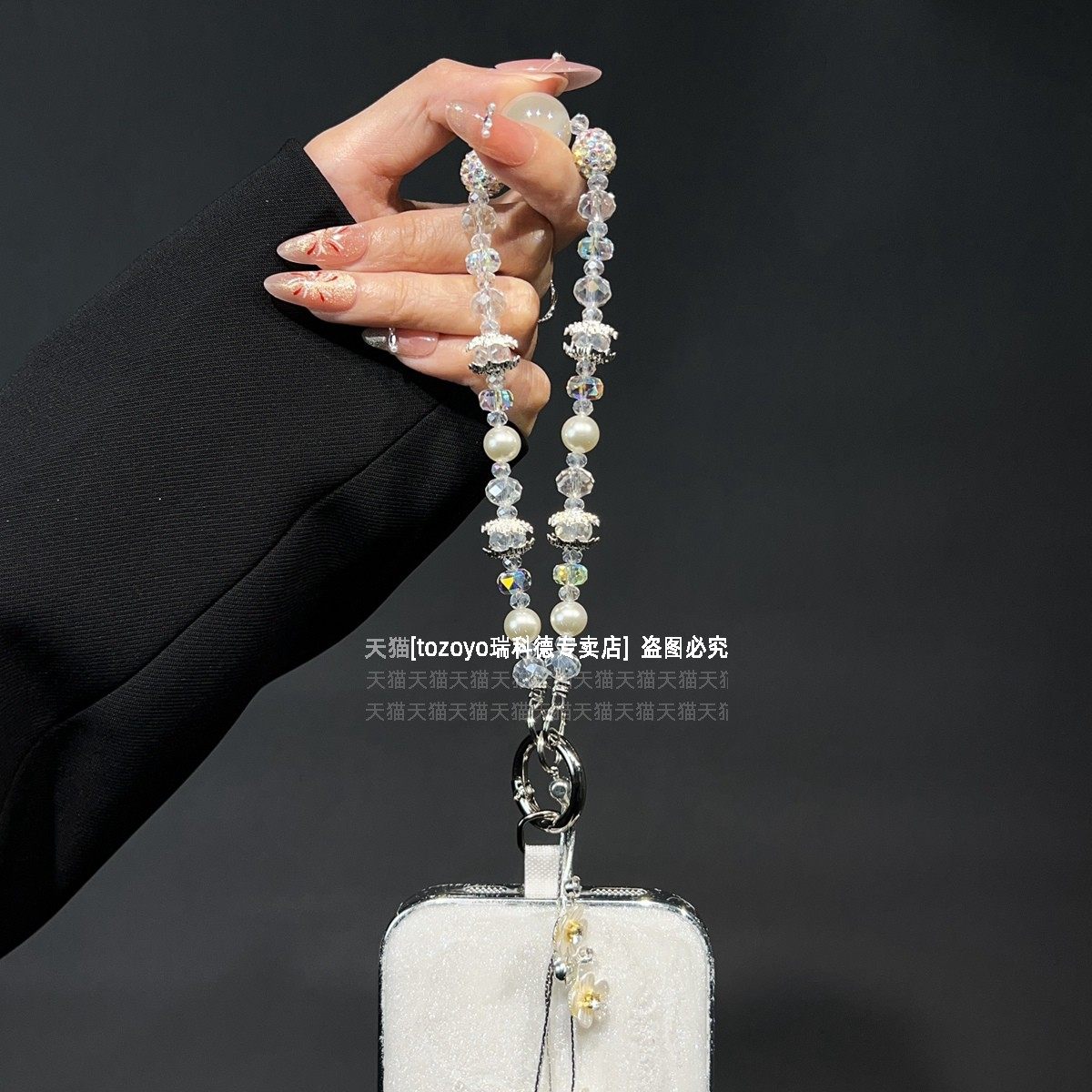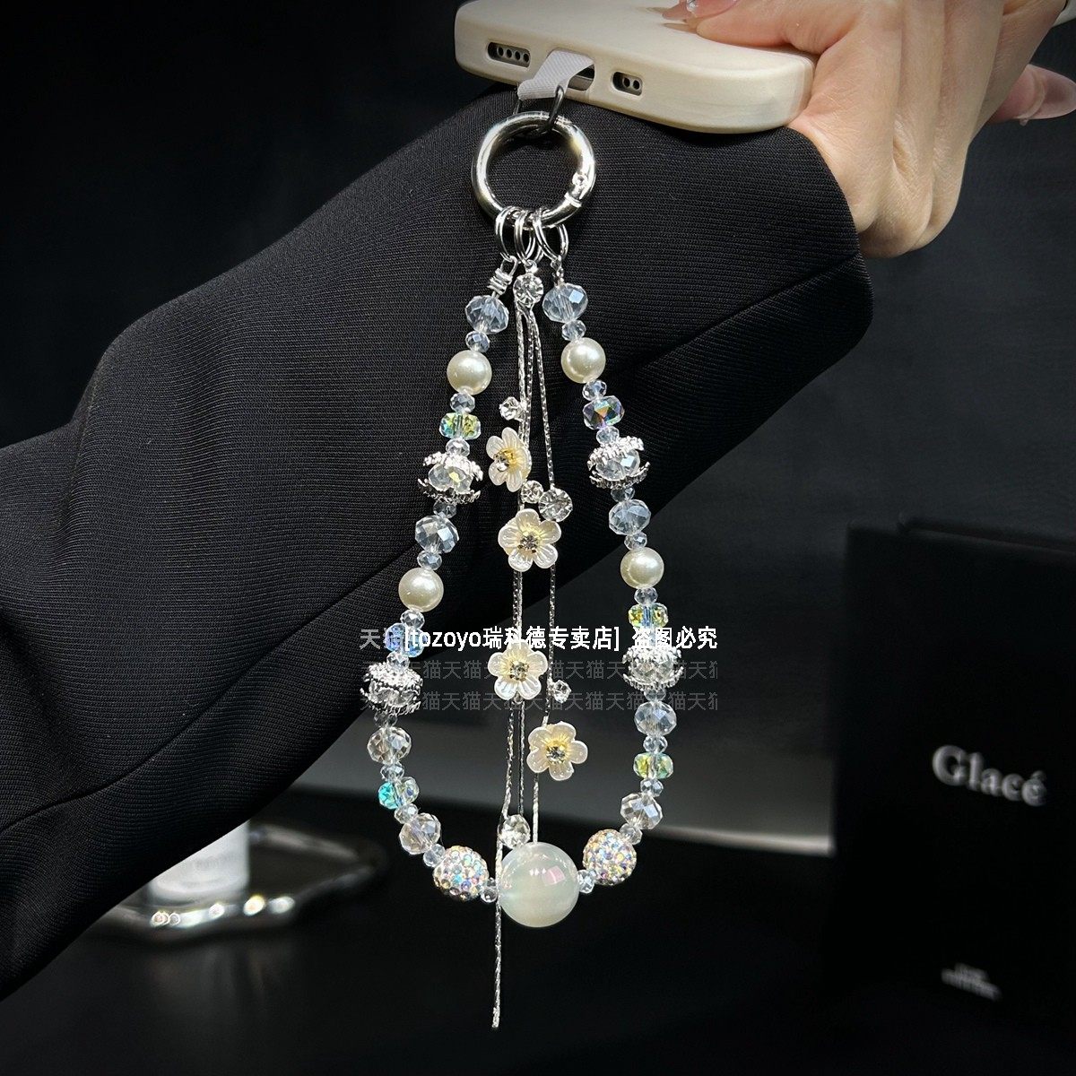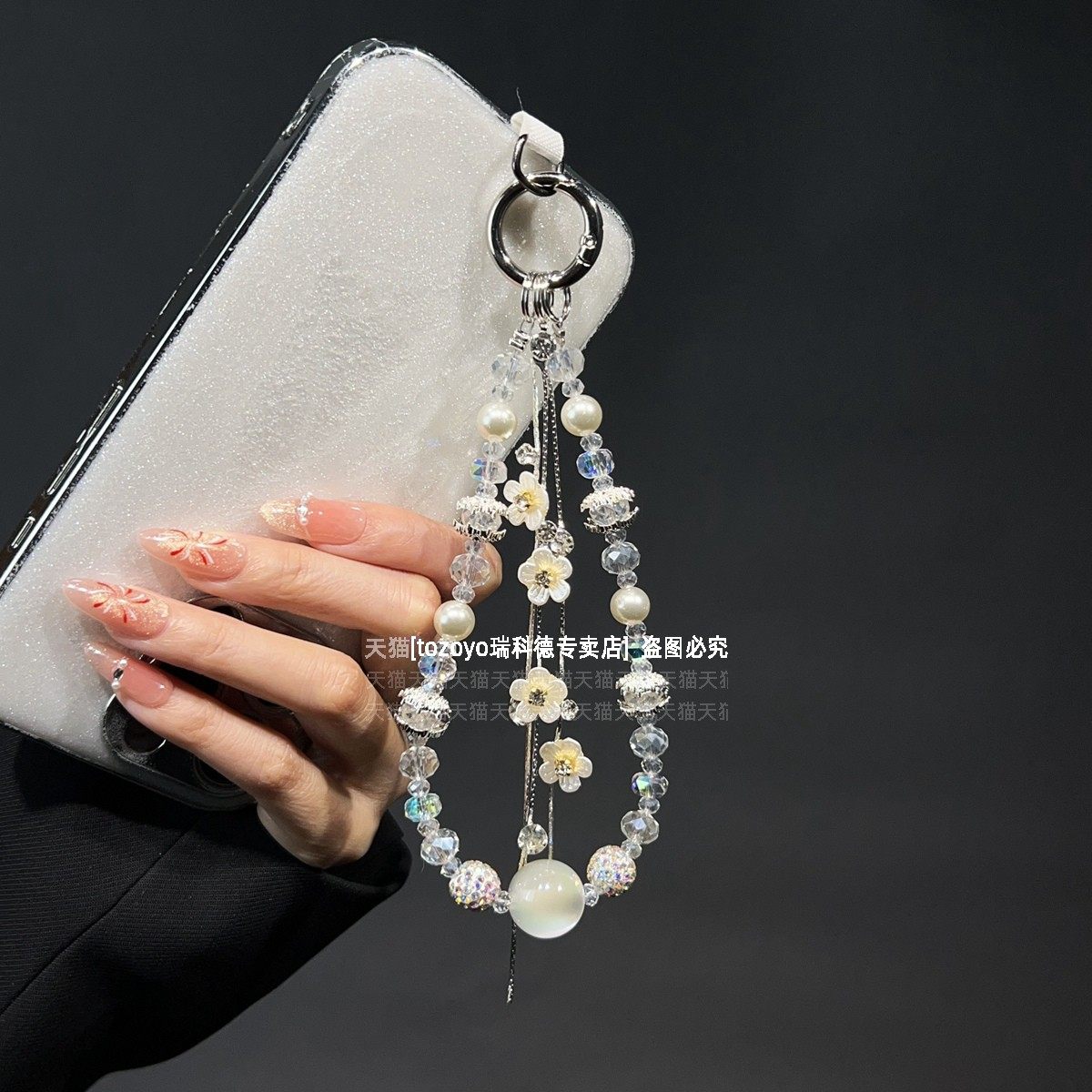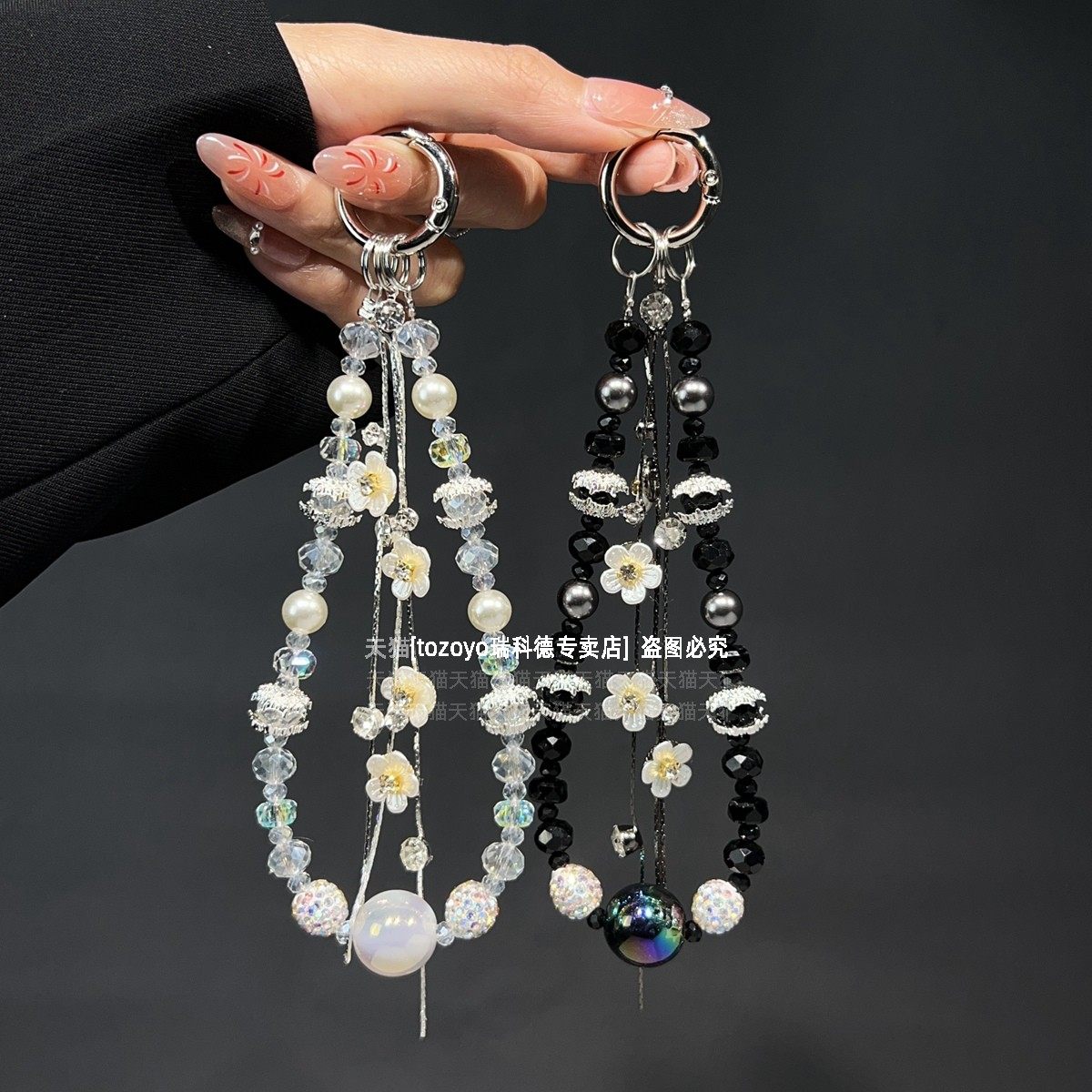 仙气花朵流苏手机链黑白高级感挂链爆闪水晶串珠手腕手链精致高级新款包包挂件防丢链条网红女手提腕链垫片壳