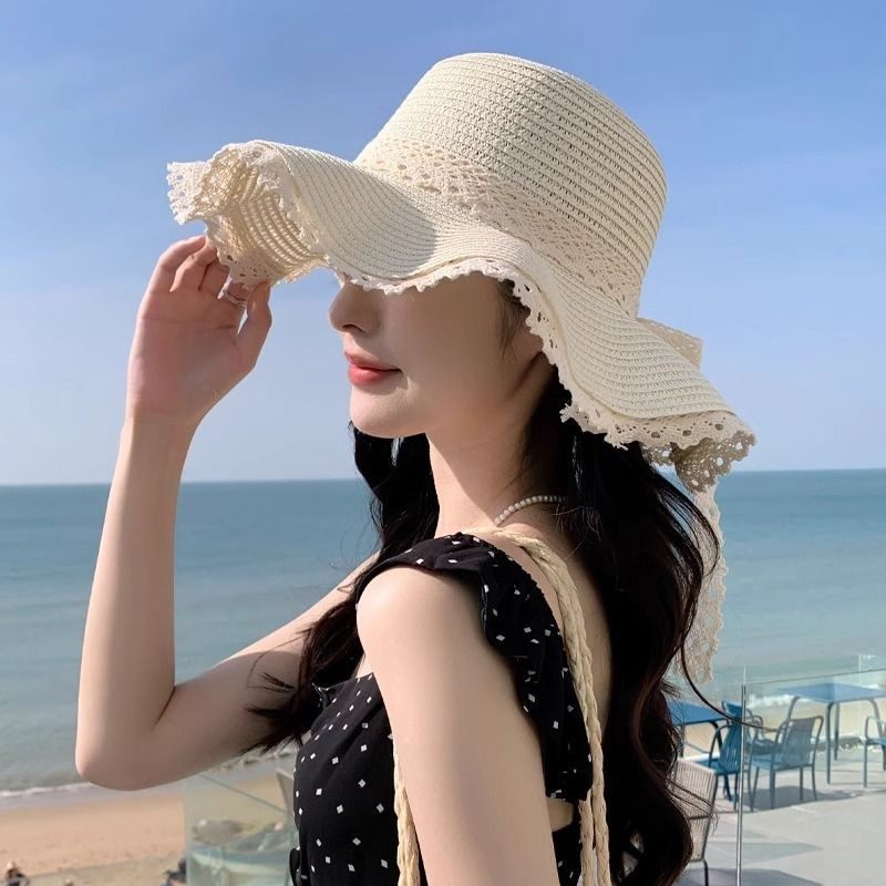 新款波浪边草帽子女春夏季百搭旅行遮阳帽网红海边度假防晒太阳帽