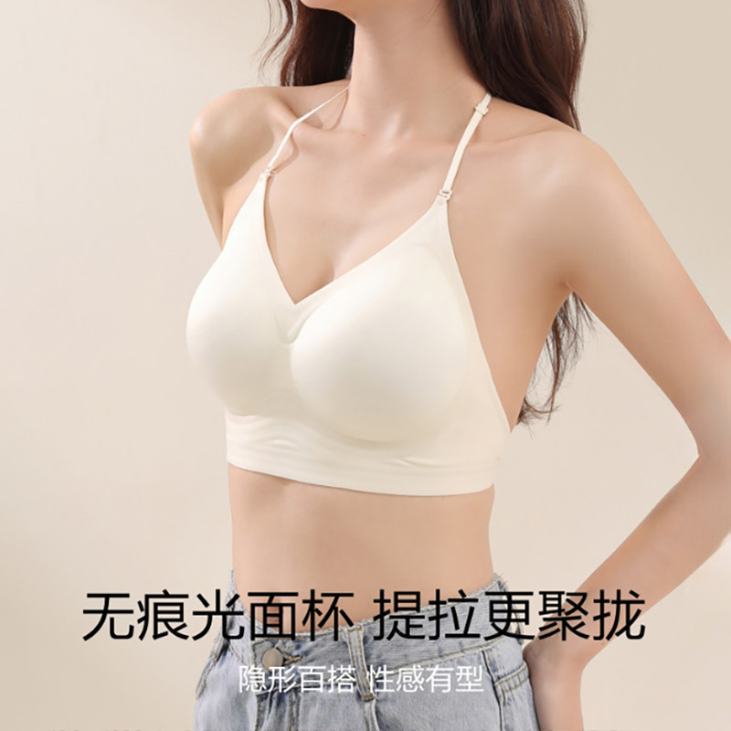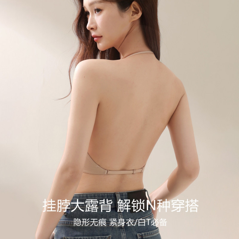 细肩带挂脖大露背隐形粉底液内衣女小胸聚拢无痕美背吊带文胸一体