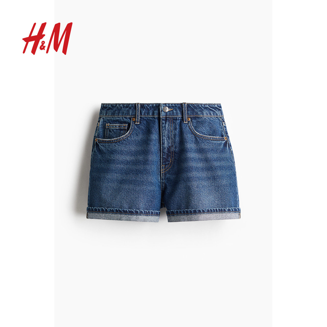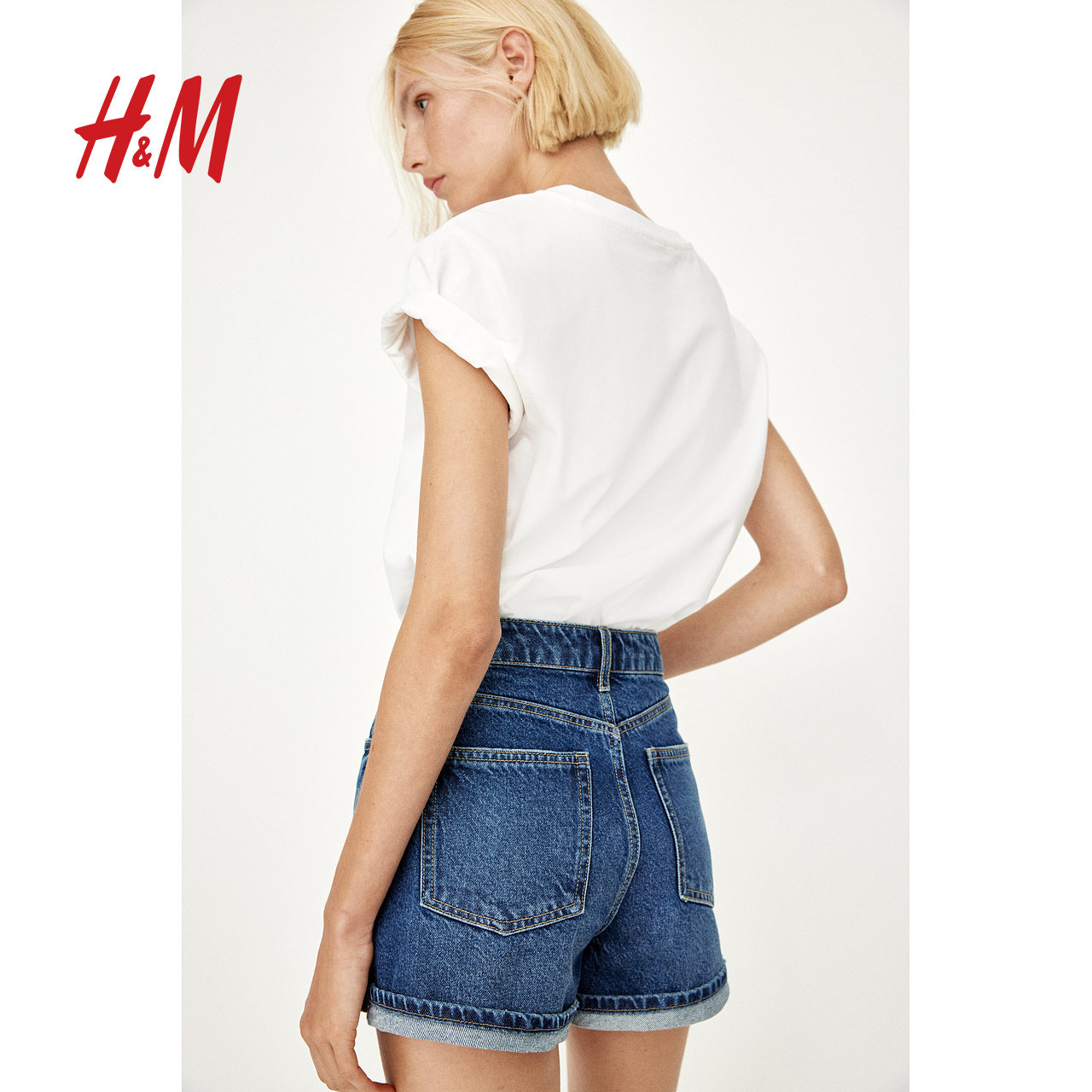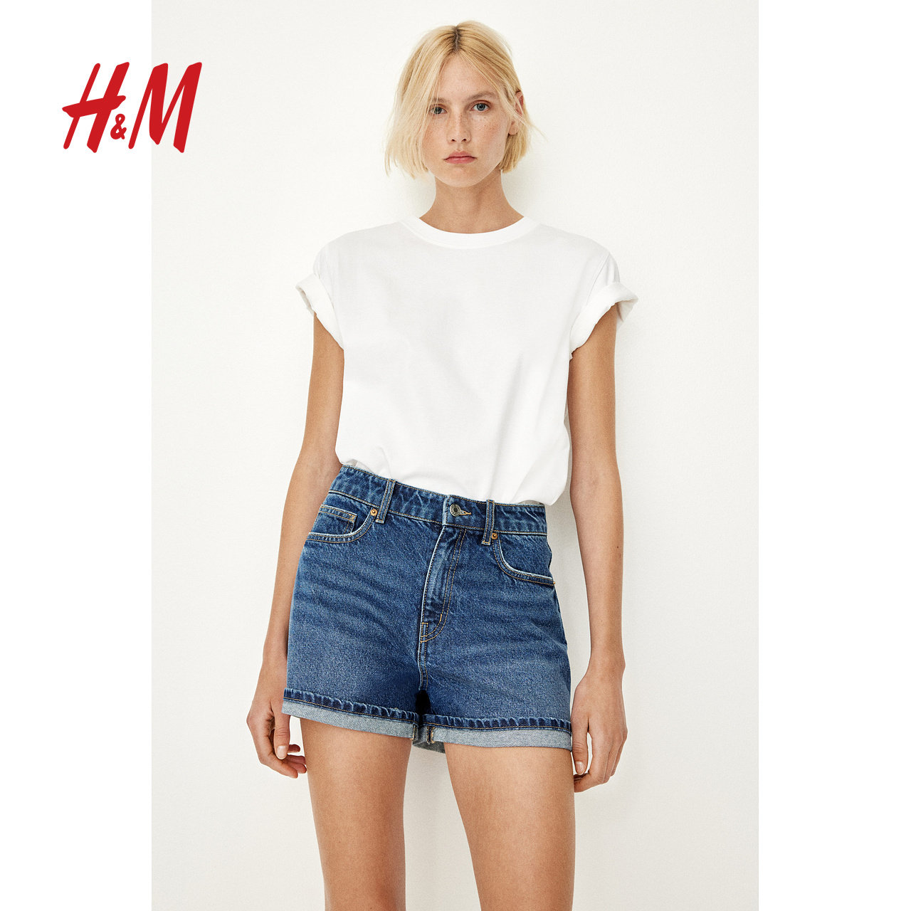 HM女装牛仔裤冬季慵懒高腰直筒棉质舒适休闲翻折辣妹短裤1222120