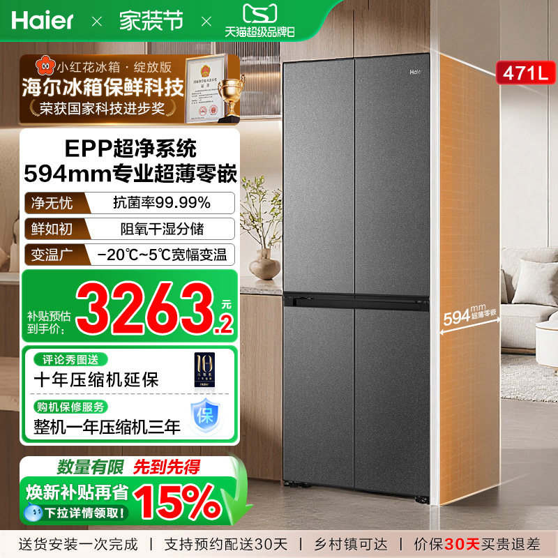 海尔小红花套系471L双开四门超薄零嵌入式能效风冷无霜家用电冰箱
