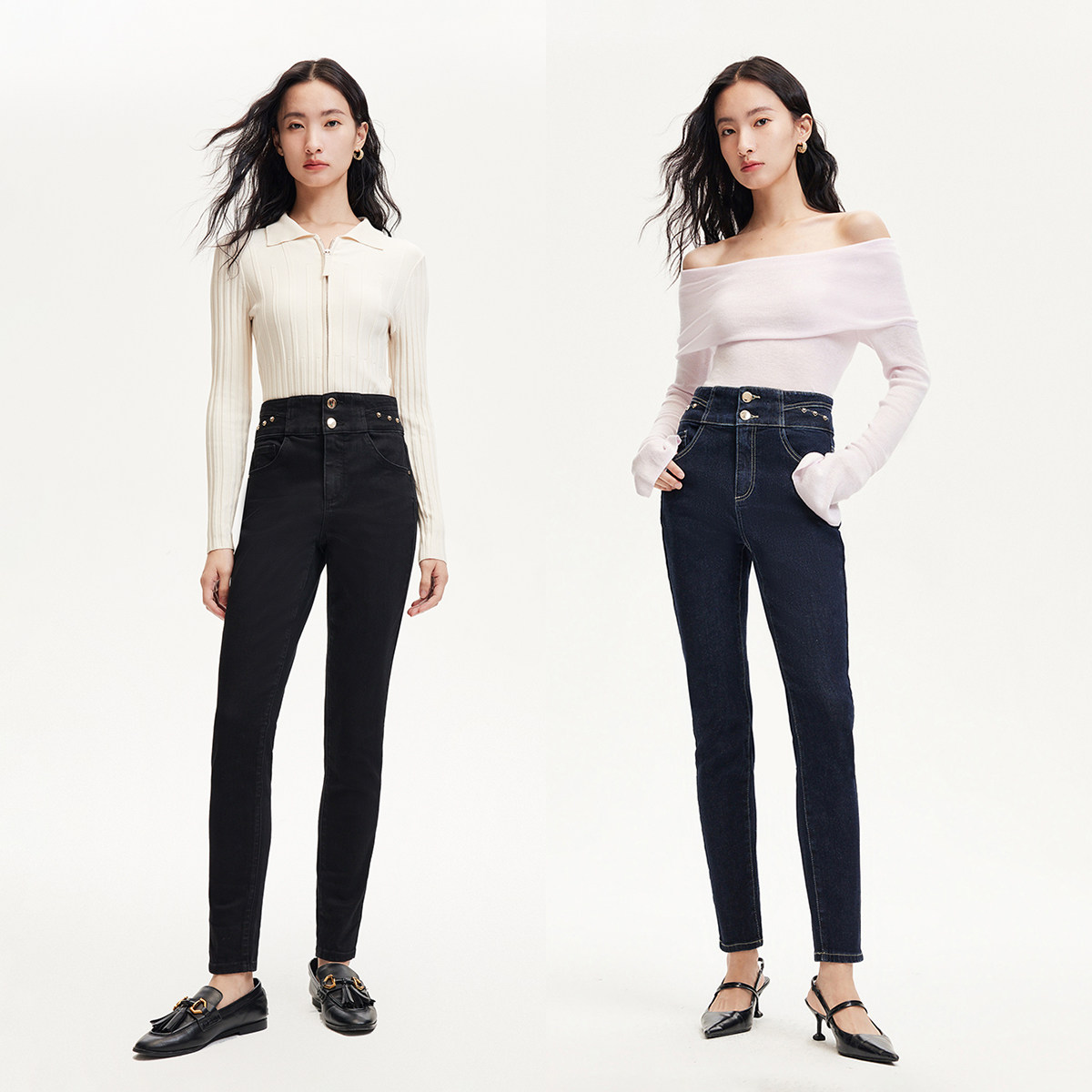 twosweet【超级裤神】四面弹重塑大长腿高腰直筒微喇叭原色牛仔裤